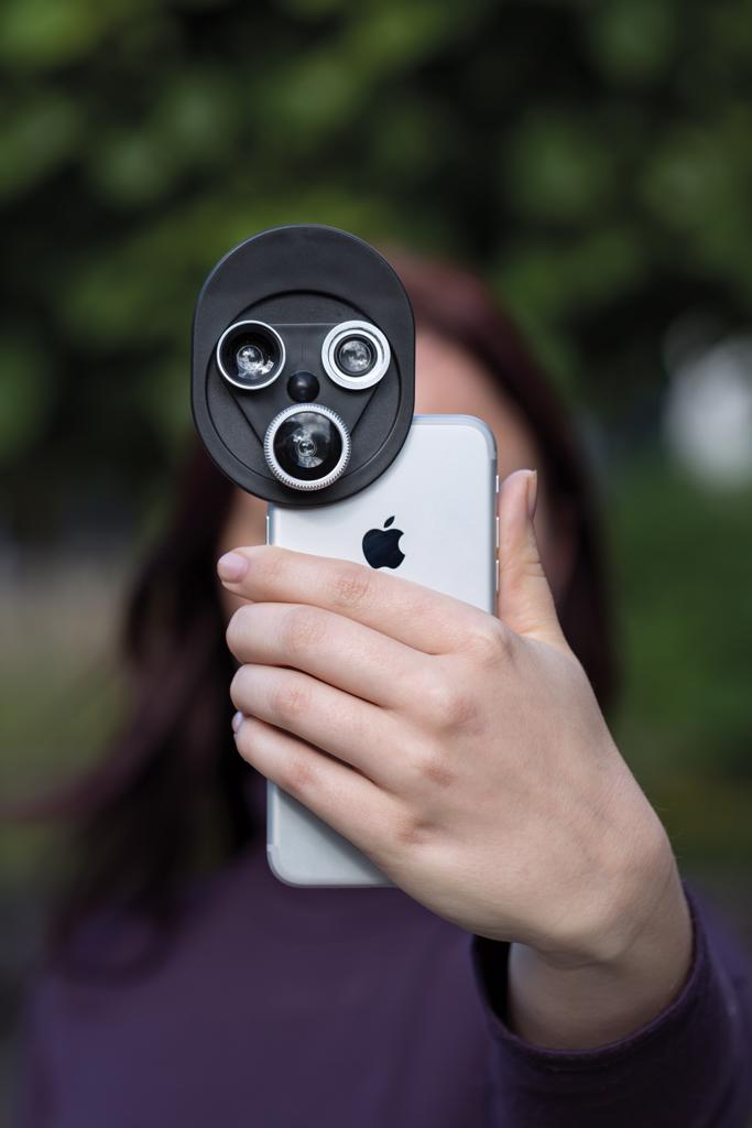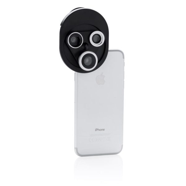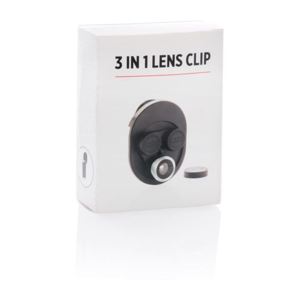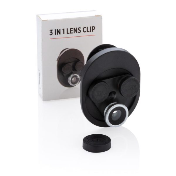 Easy to attach and use 3-in-1 revolving camera lens clip. This clip comes with: a fisheye lens, a wide-angle lens and a macro lens. To use the clip clip, simply attach it clip to your mobile device and twist to try all 3 lenses. ABS/acrylic material.