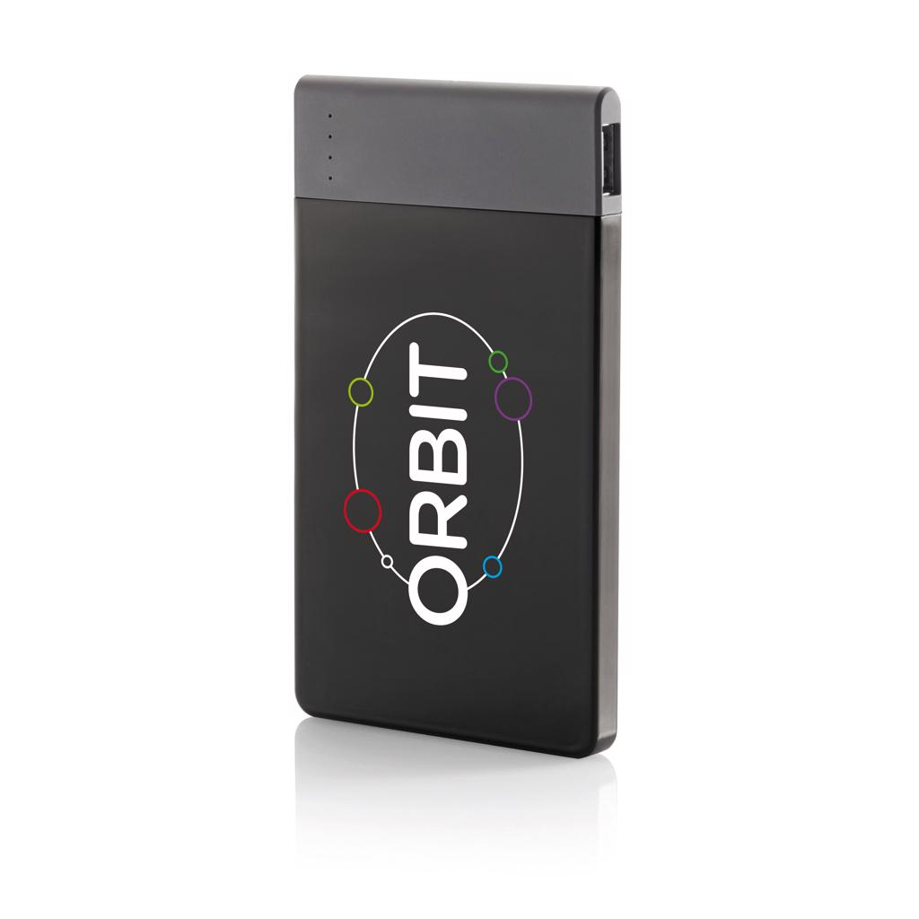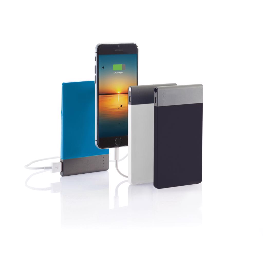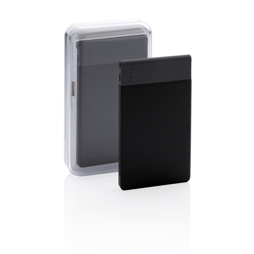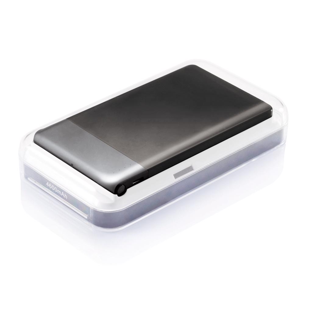 4600 mAh thin powerbank with high quality lithium polymer battery. Including on/off button to switch of the power current and battery capacity indicator. Output 5V/2.1A, input 5V/1A. Packed in transparent gift box.