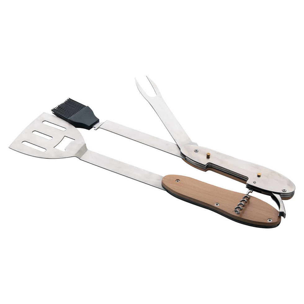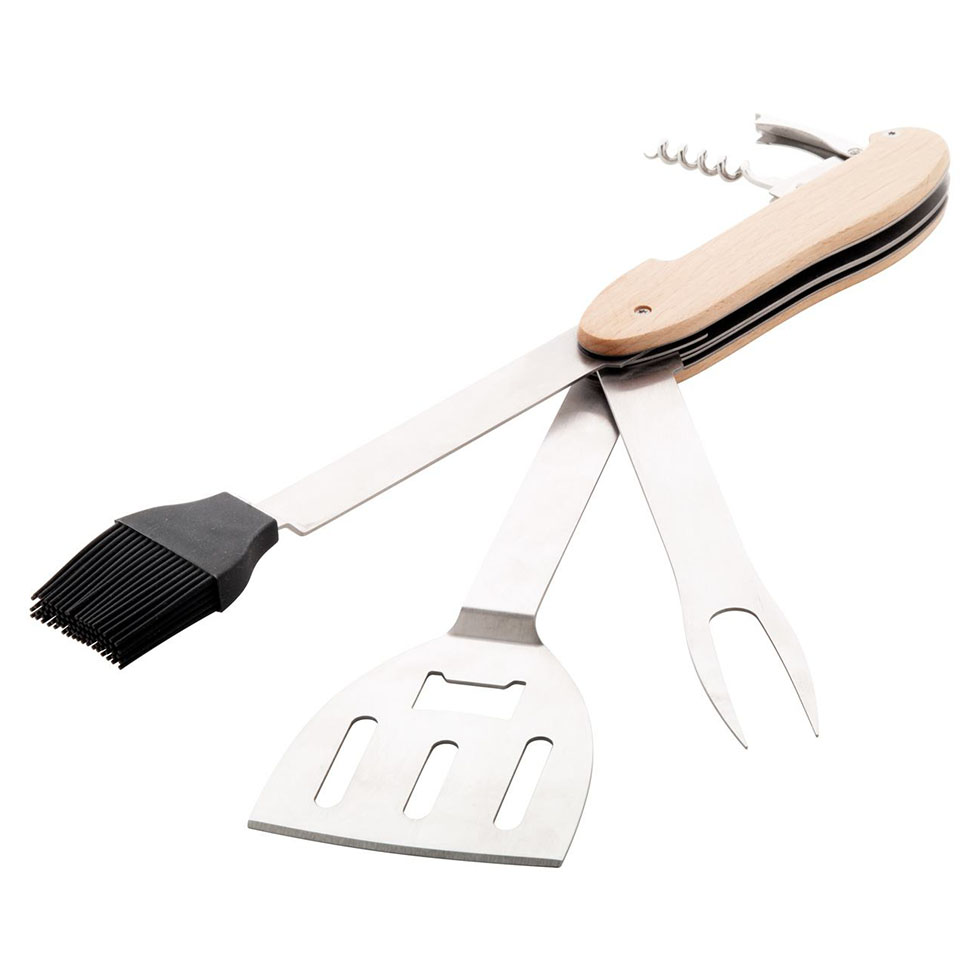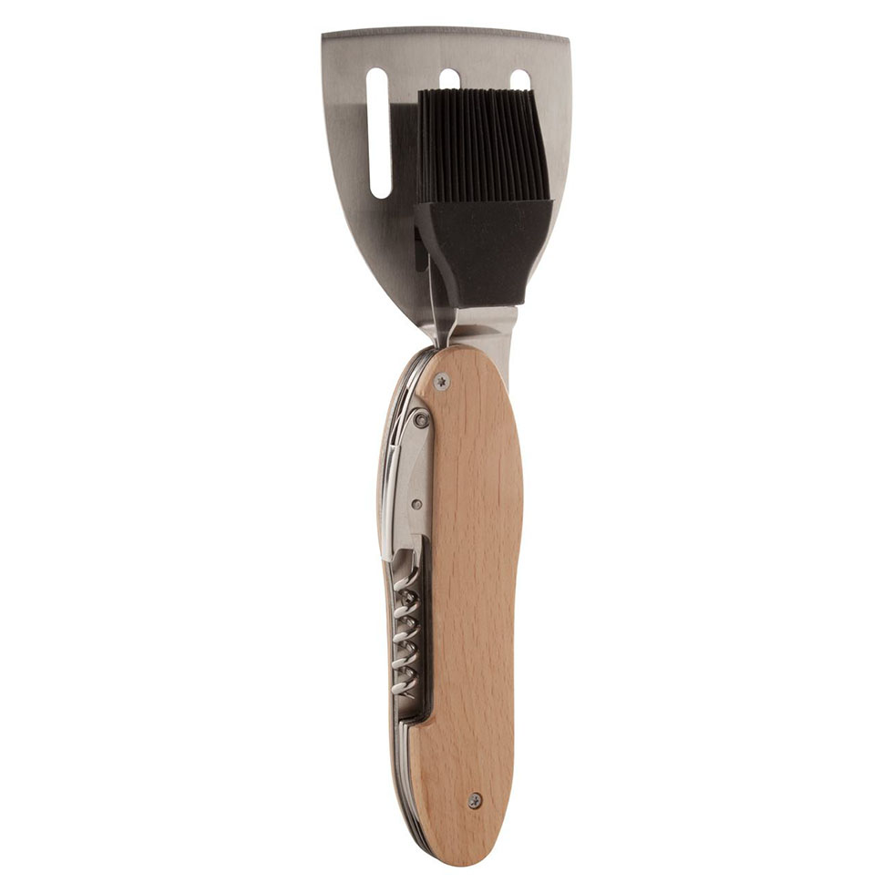 5 in 1 folding BBQ multi tool in stainless steel with wooden handle. With spatula, fork, brush, bottle opener and corkscrew. Separates into 2 separate tools through a sliding system.