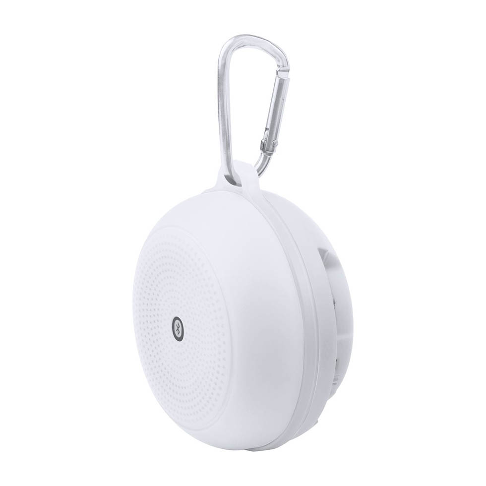 Bluetooth speaker with plastic housing and aluminium carabiner. With hands-free call function and built-in rechargeable battery. Including USB charger and aux-in cable.