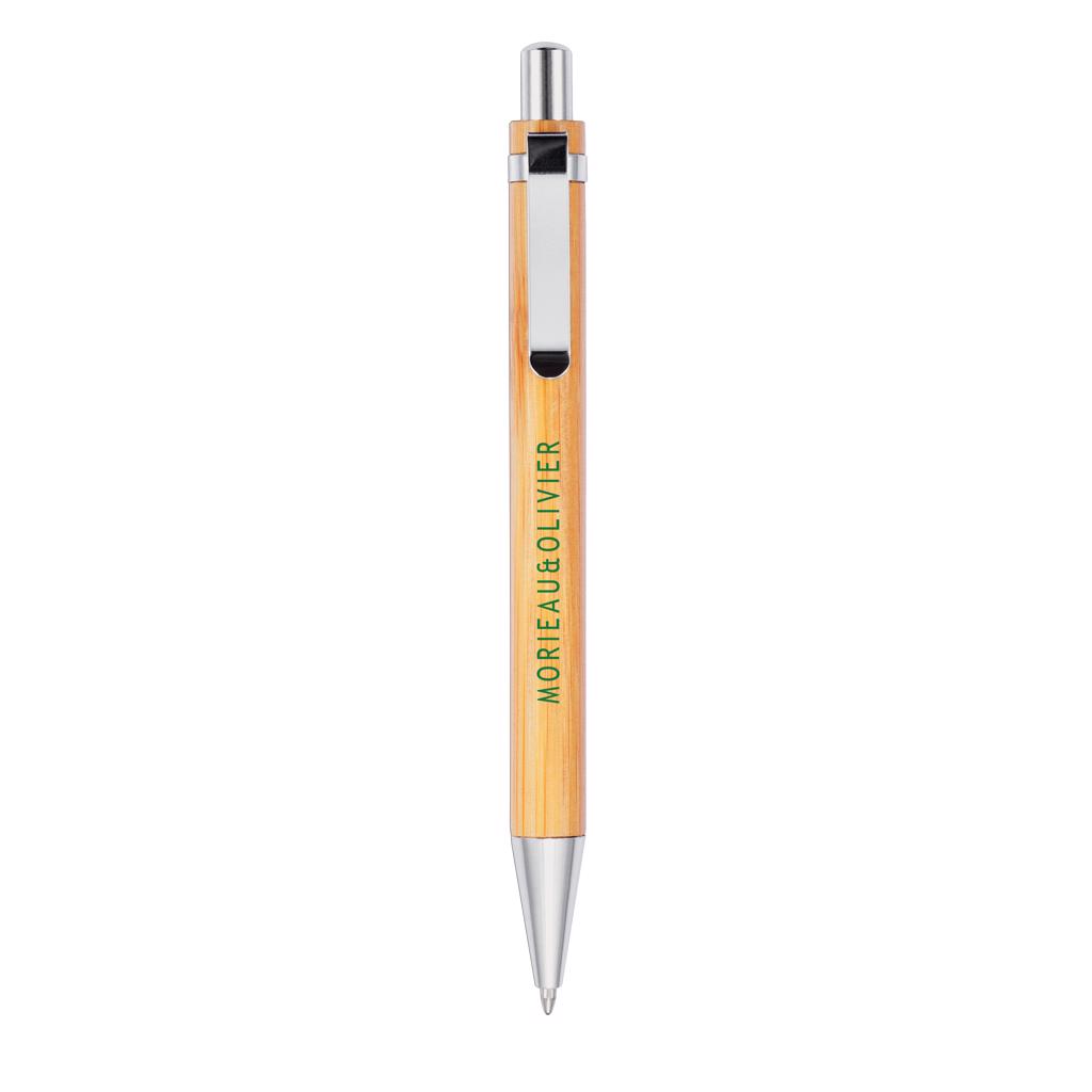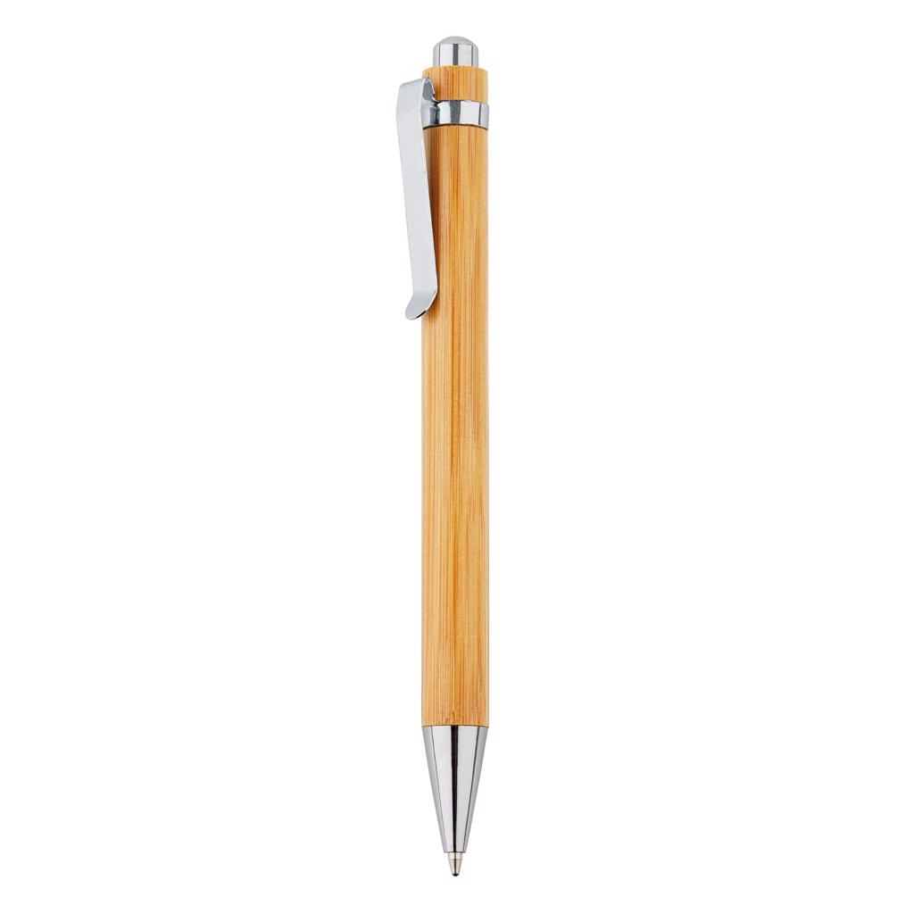 Bamboo ballpoint pen with metal ring and clip.