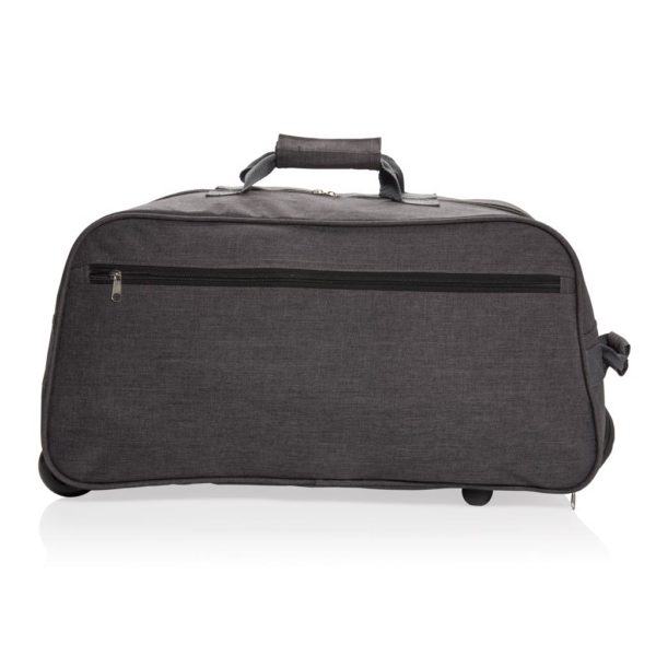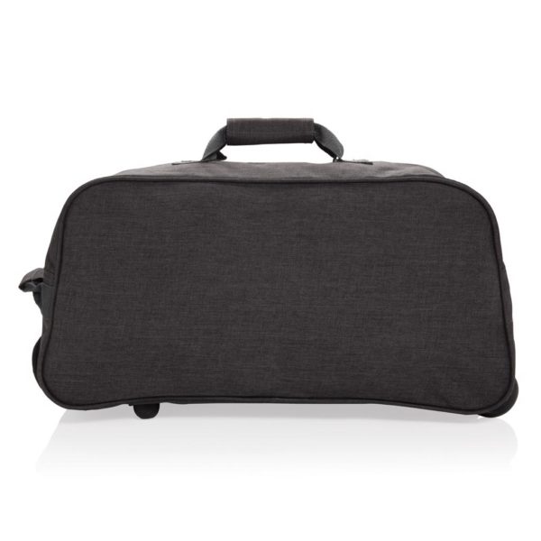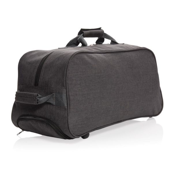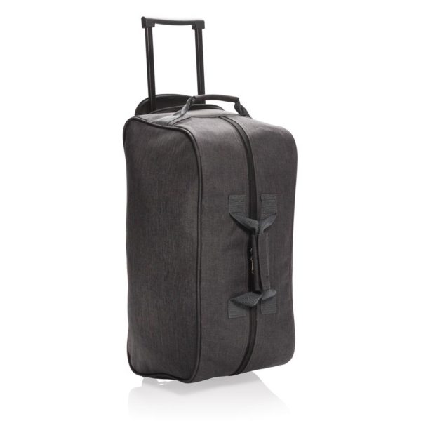 600D high density extra strong two tone polyester fabric. With extendable trolley system. One front pocket and one zipper closure main compartment.