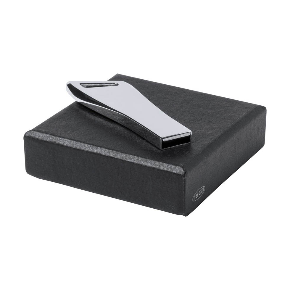 16GB USB flash drive with innovative design, ideal for keychain. Shiny metal body. In elegant cardboard box with foam inside.