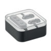 4.2 Bluetooth earphones in ABS with built in microphone. Rechargeable Li-ion 55 mAh battery. Playing time approx. 2 hours. Includes a micro USB charging cable. Operating range: 2m. Presented in a plastic box.
