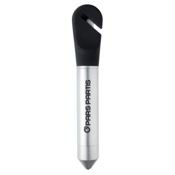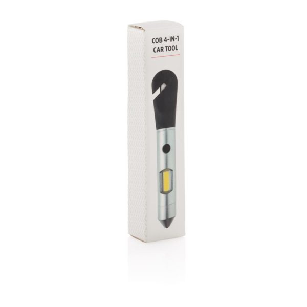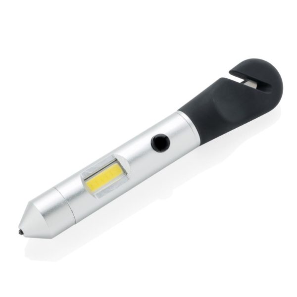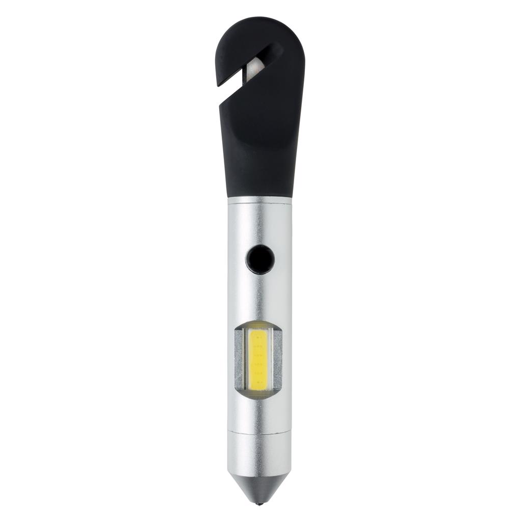 Multifunction tool that includes a COB light, safety hammer, belt cutter and magnet. The light can be switched into red emergency mode to attach to your car with the built-in magnet. The safety hammer and window breaker can be used to escape in case of an unfortunate situation. Made out of silicon and aluminium material. Includes 4 cell batteries for direct usage.