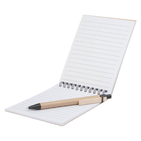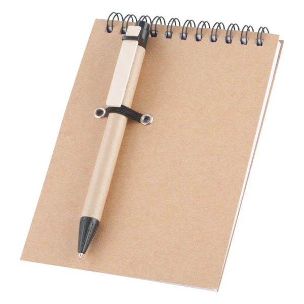 60 sheets spiral notebook with ballpoint pen (blue refill), made of recycled paper.