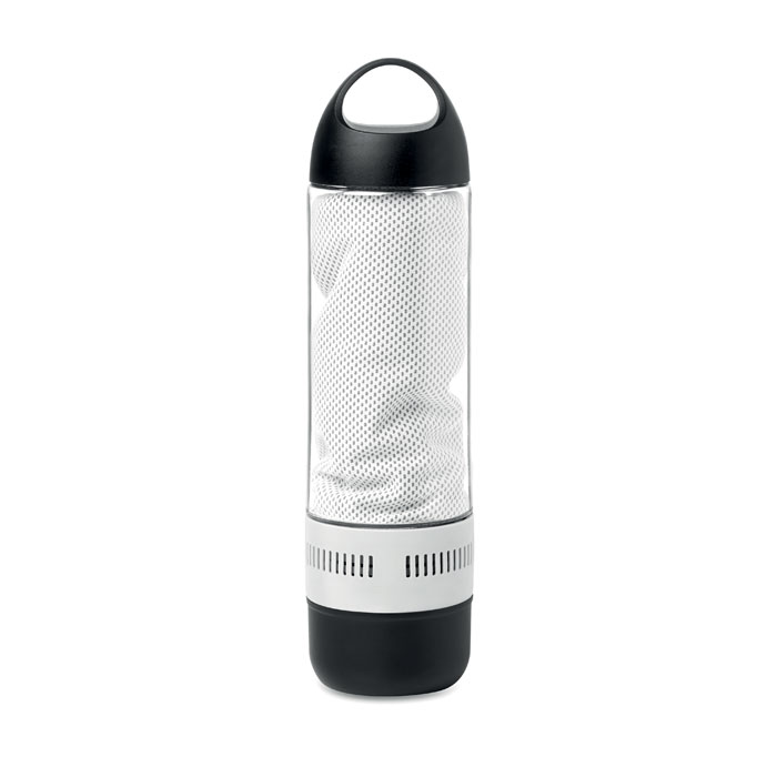 Wireless speaker bottle in 500 ml. Including a 55% polyester fibre towel (30x80cm). Rechargeable Li-on 300mAh battery included. Mirco USB cable included. Output data: 3W.