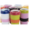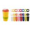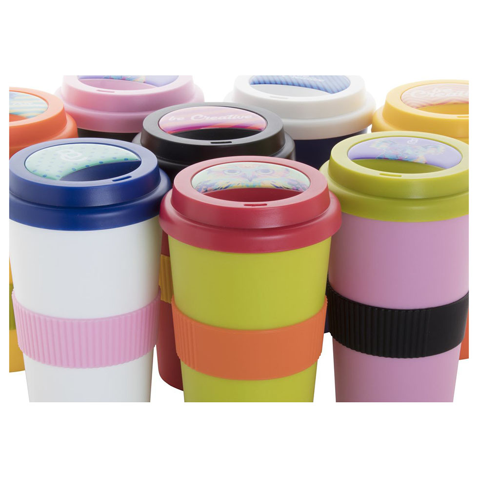 Customisable, double wall plastic thermo mug with drinking lid and silicone grip. 400 ml. MOQ: 50 pcs.