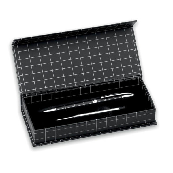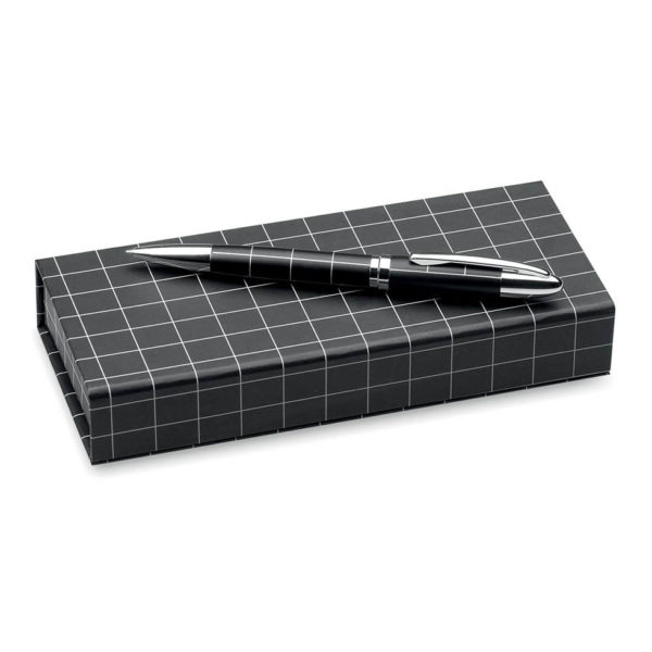 Metal ballpoint pen with blue refill in matching pattern paper gift box.