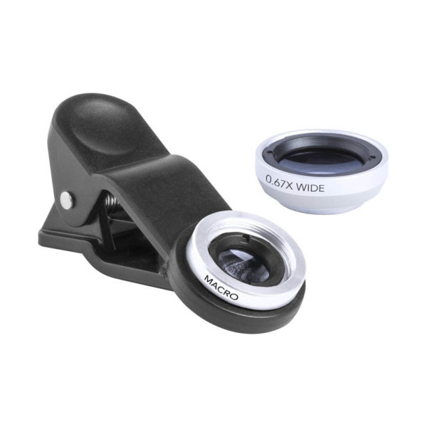 Smartphone lens kit with 2 lenses (macro and wide-angle) with universal clip, in carry pouch.
