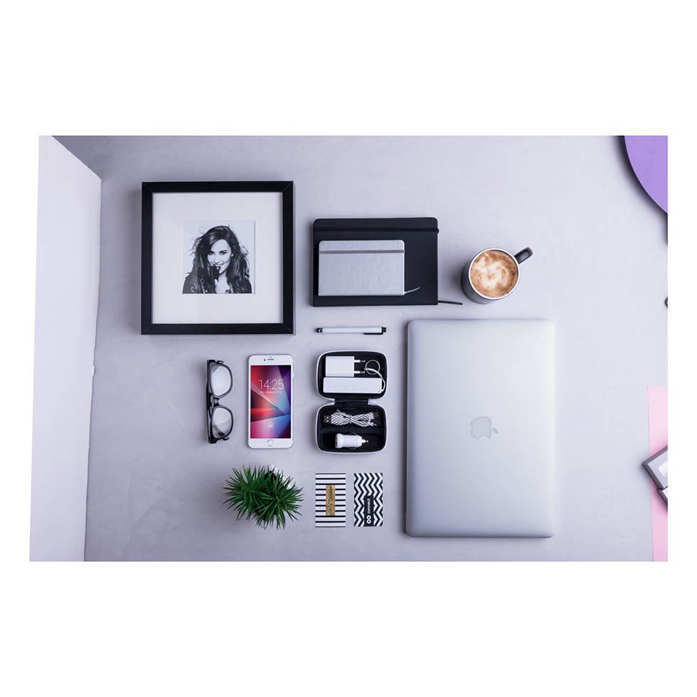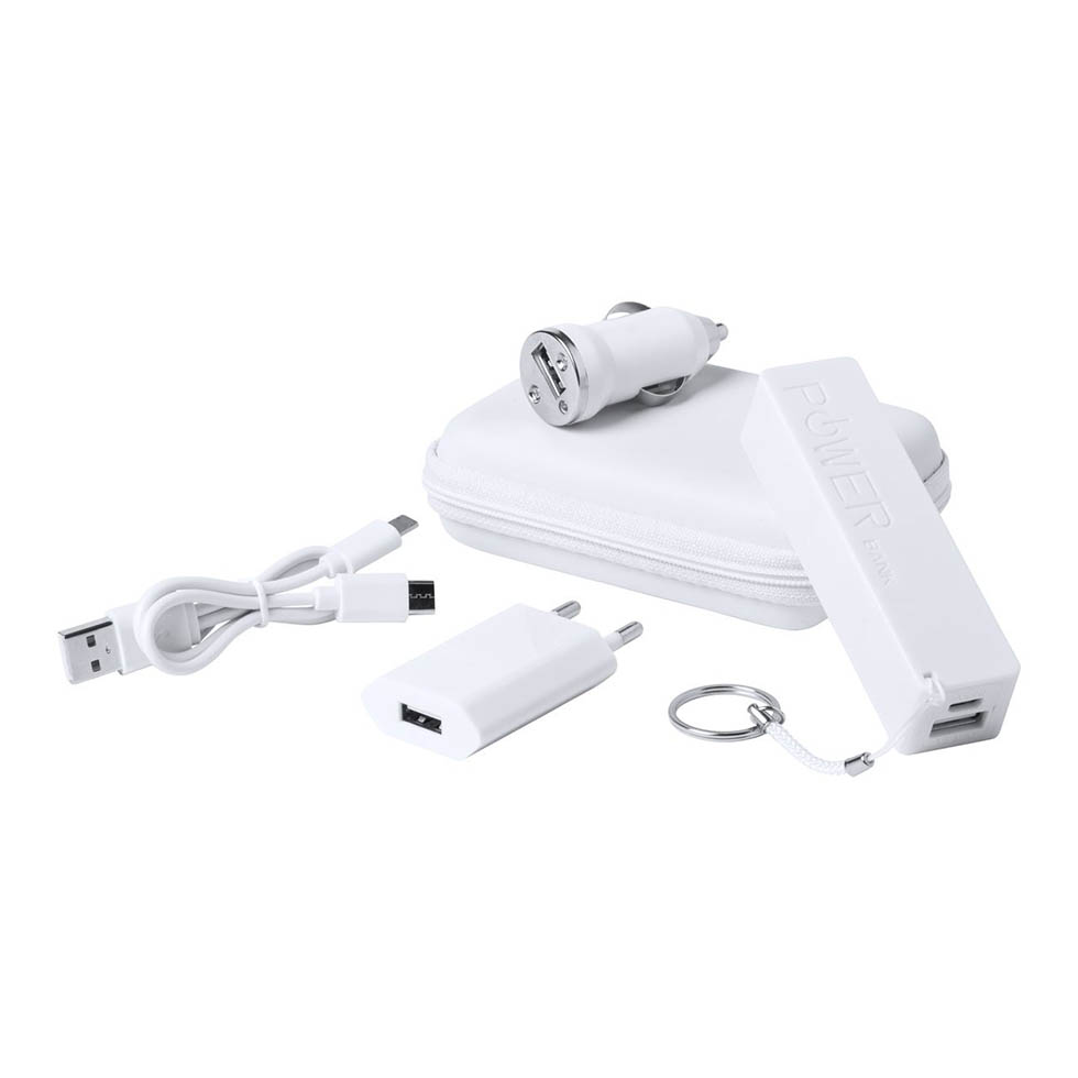 USB charger set in PU leather zipped case including USB car charger (max output: 1000 mA), AC charger (max output: 1000 mA), USB power bank with 2000 mAh battery. Including USB charger cable with micro USB, Type-C and Lightning connectors.