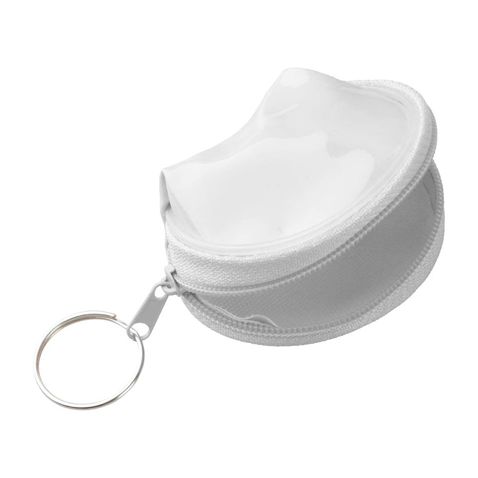 Zipped, mini purse with metal keyring, made of PVC.