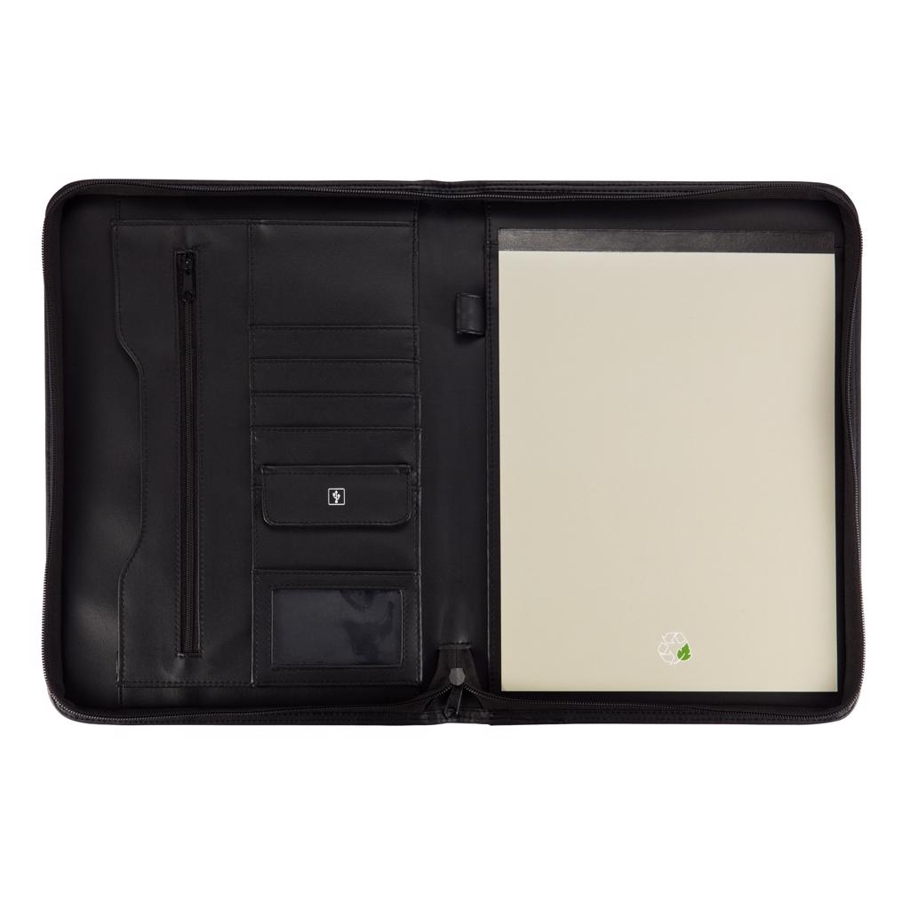 Zipper portfolio with zipper closure, zippered pocket and slide in pocket inside, 4 name card holders, USB pocket and pen holder, including A4 writing pad with beige cover, 20 sheets recycled paper with recycle logo.