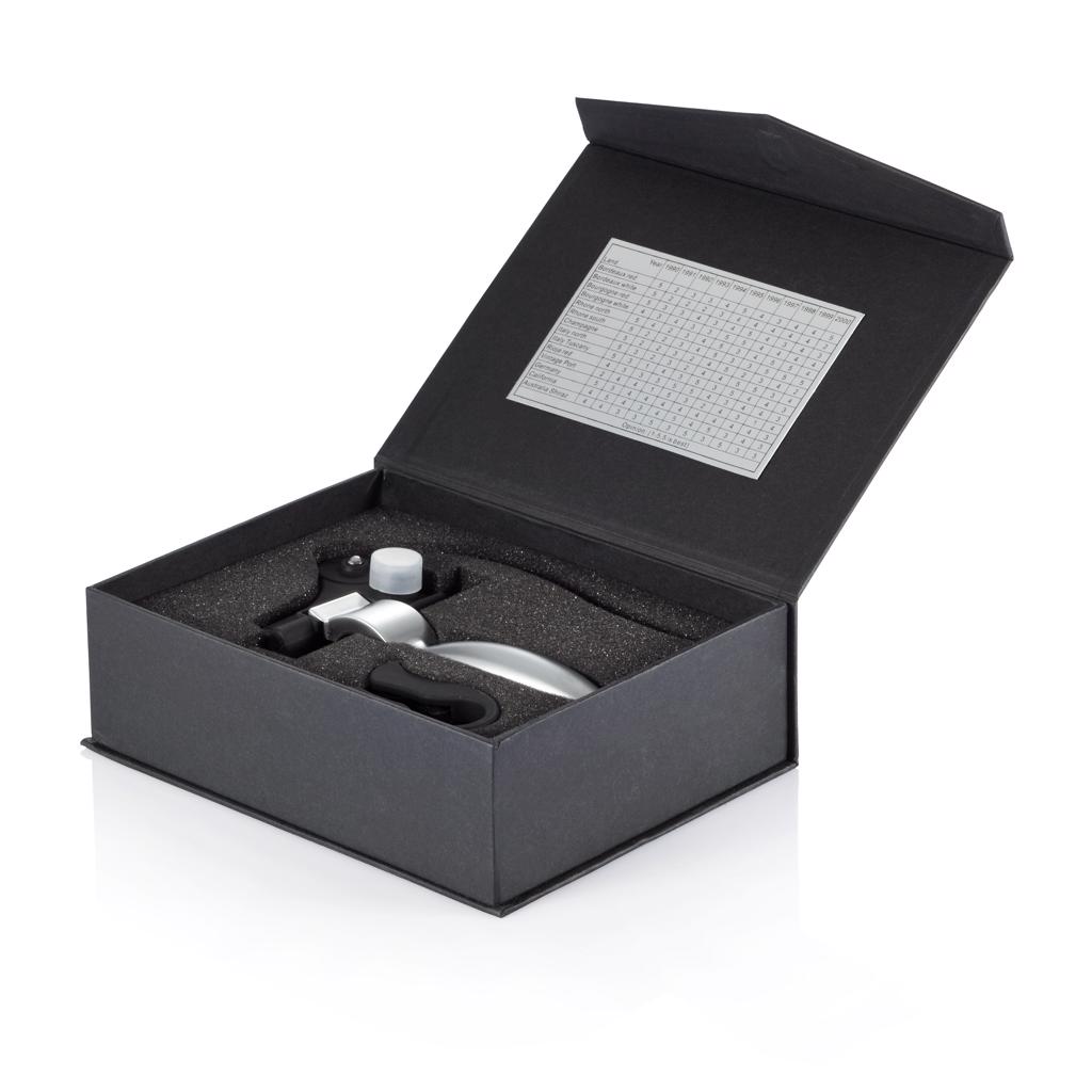 Corkscrew with lever mechanism made of aluminium, hardened steel and teflon coated spiral, including foil cutter and plaque with a review of the best wine regions as of 1990.