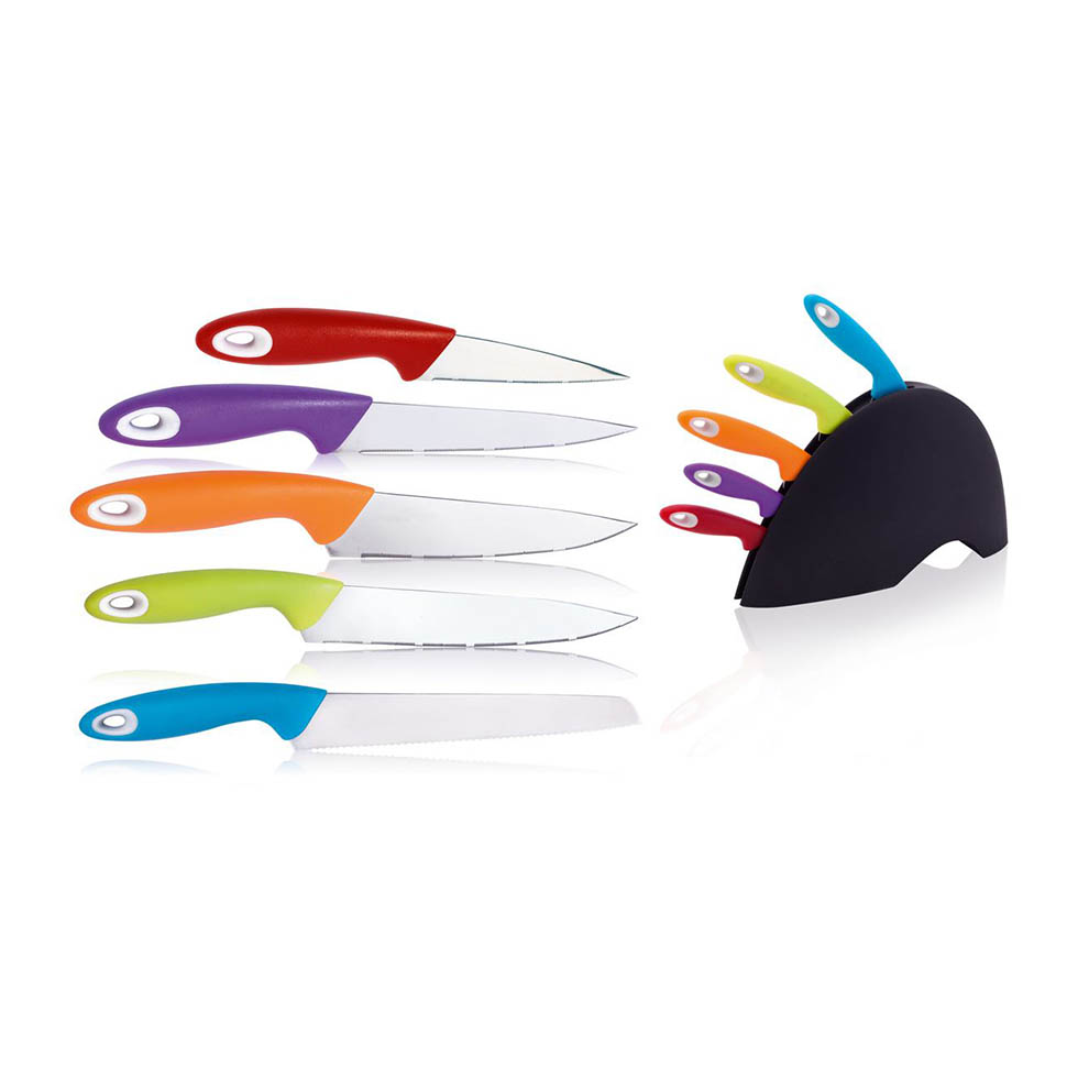 5 stainless steel knives with different coloured grip and in different sizes, with rack.