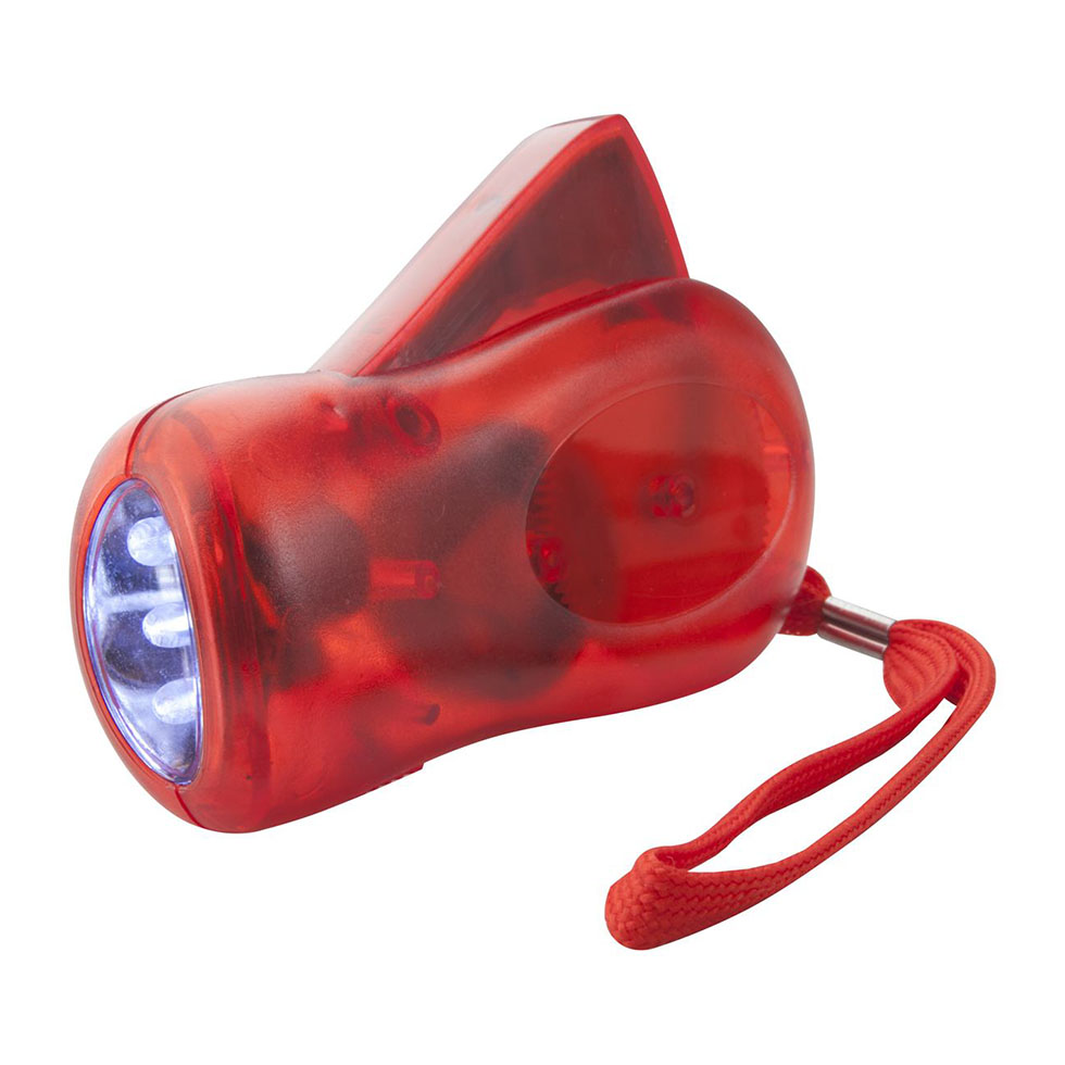 Plastic dynamo flashlight with LED light and carry strap. Rechargeable with button on the side.