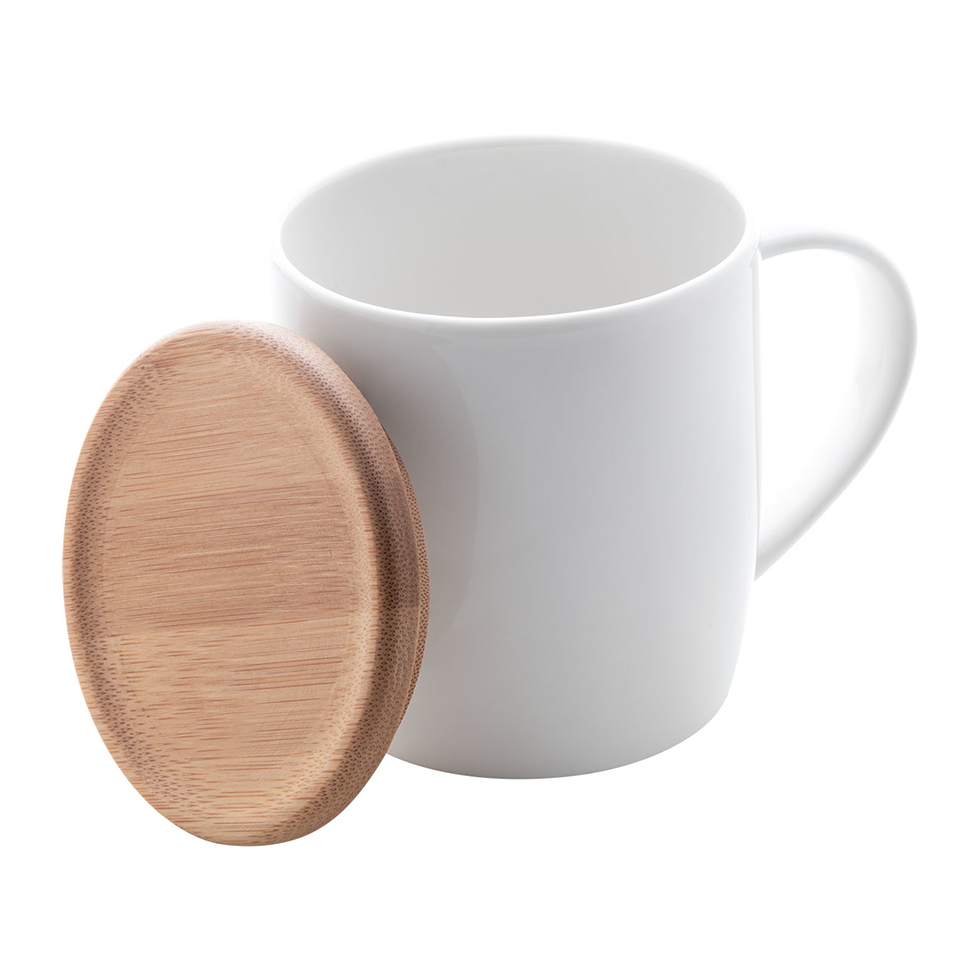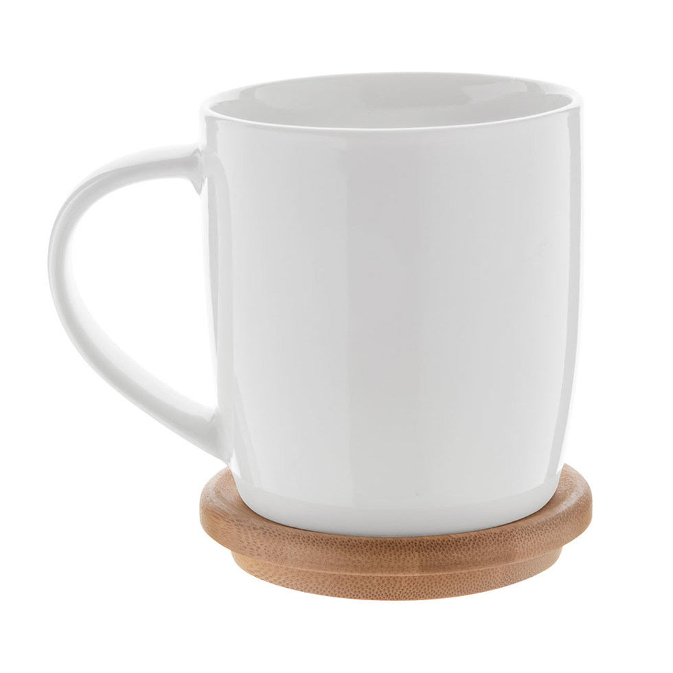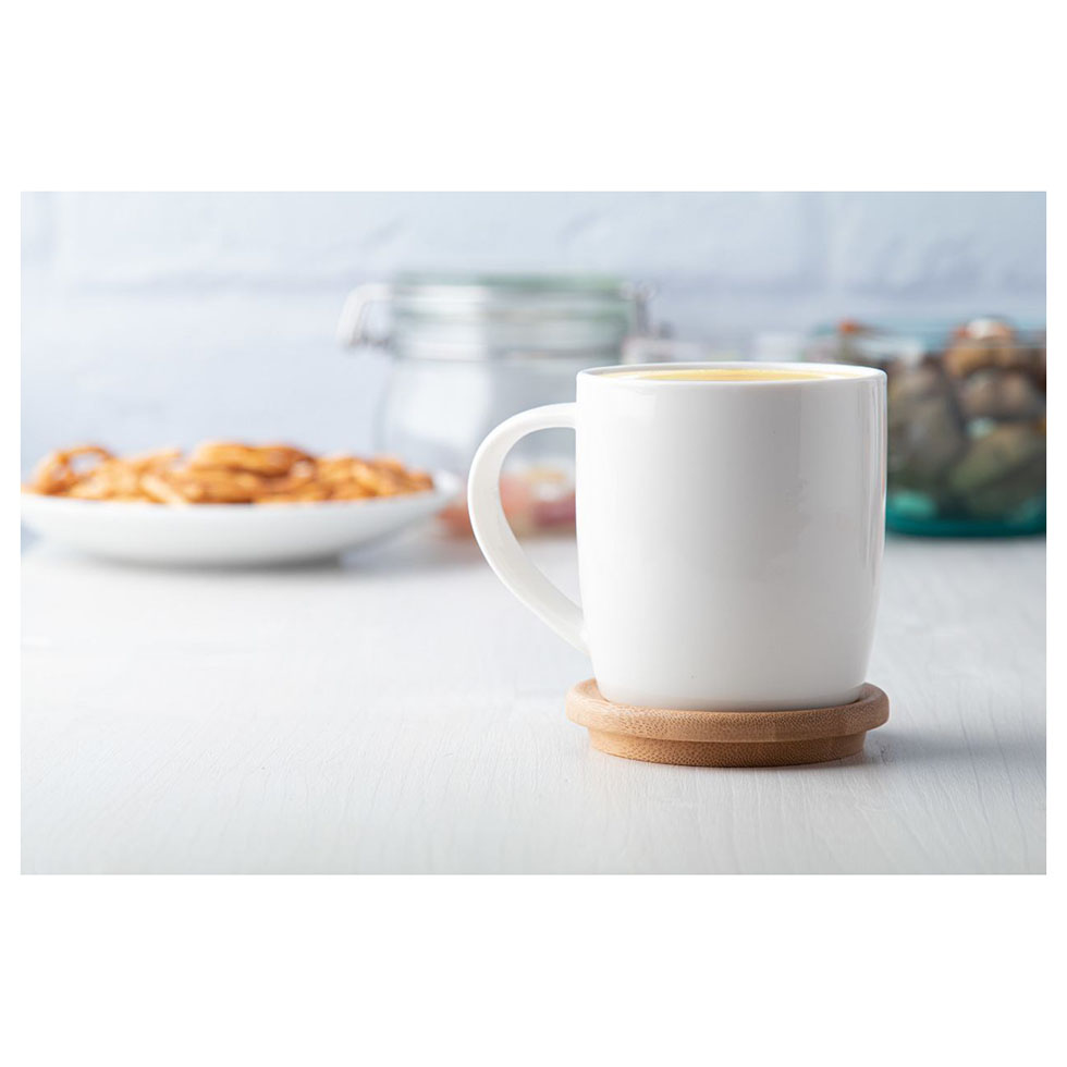 High quality porcelain mug in white colour with bamboo coaster, 320 ml. In gift box.