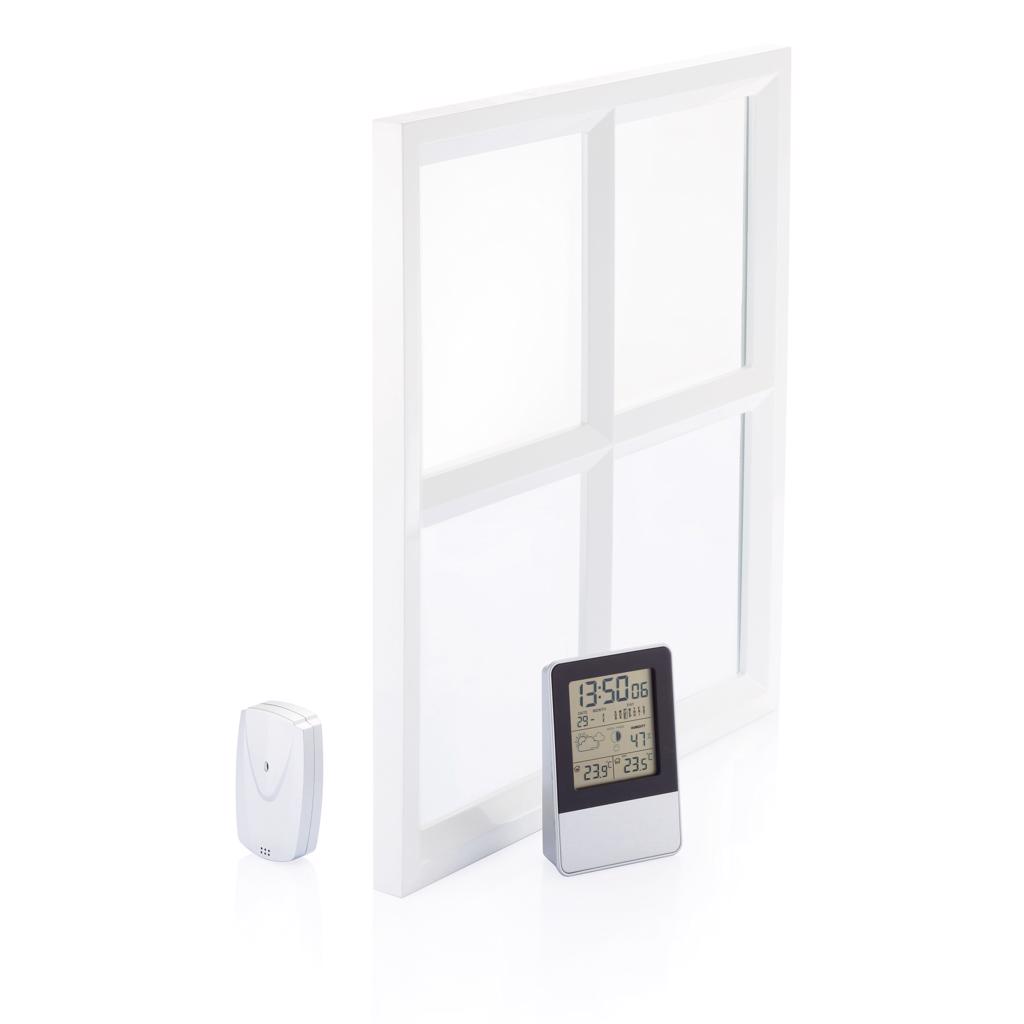 In/outdoor weather station with LCD screen and special outdoor sensor. Functions: Time and calendar, indoor/outdoor temperature, weather forecast, humidity and alarm.