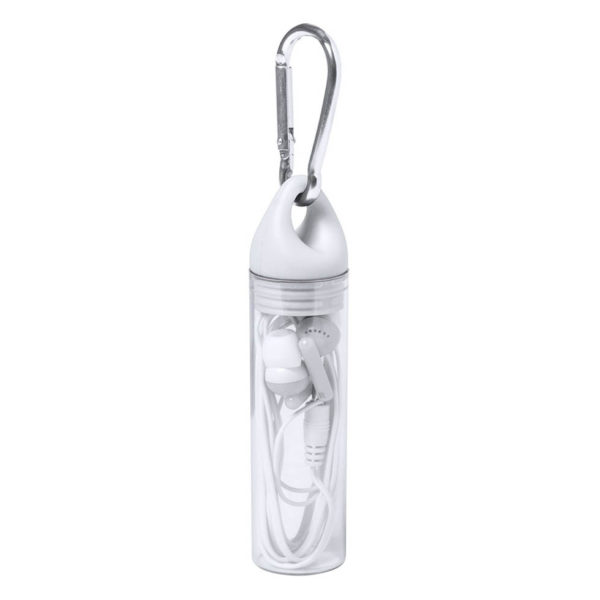 In-ear earphones with 3,5 mm audio Jack, in plastic case with carabiner and matching colour cap.