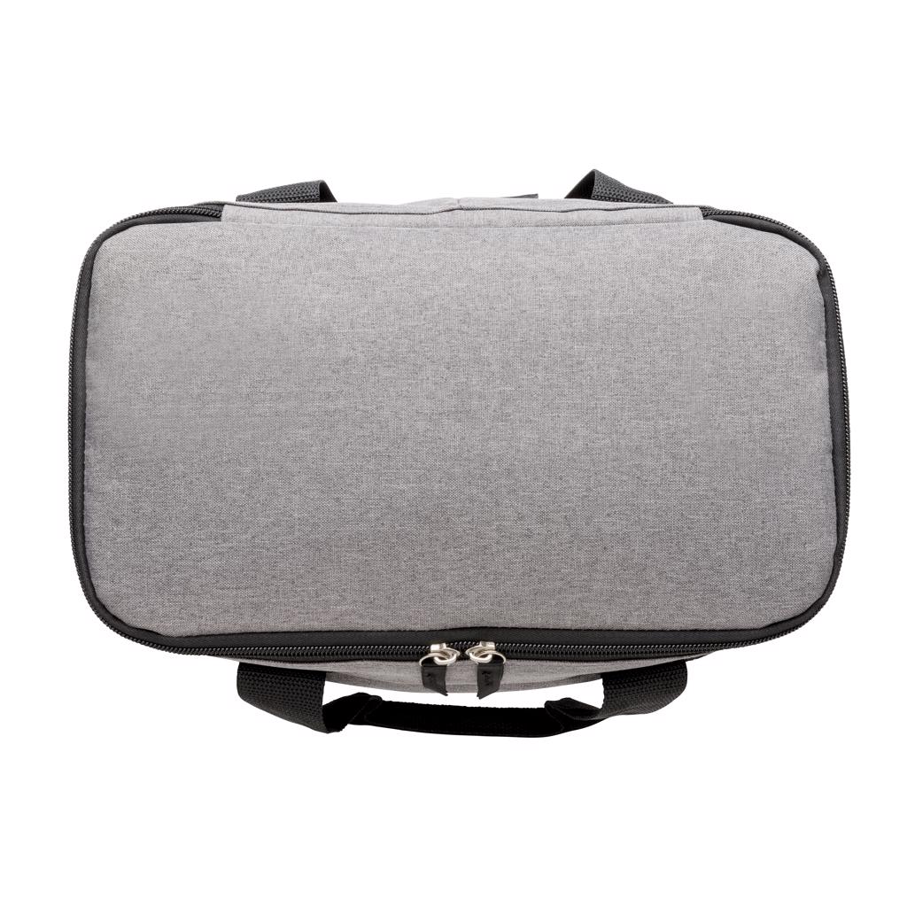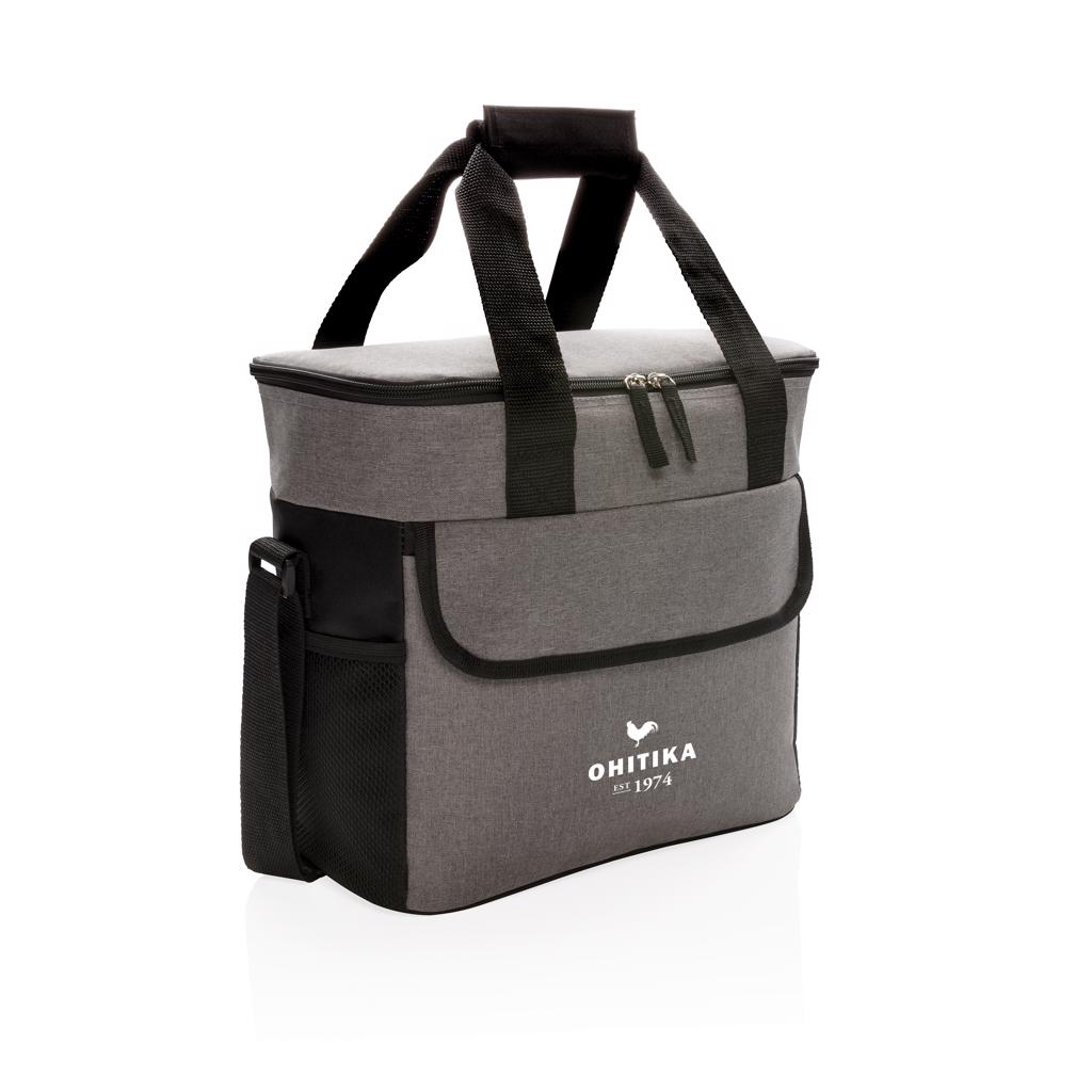 600D two-tone polyester large cooler bag can store up to 20 cans. With 2 mesh side pockets and 1 front pocket.