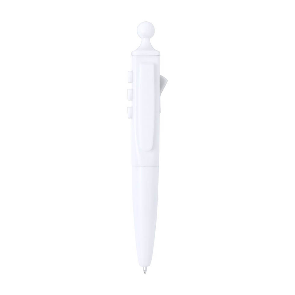 Plastic ballpoint pen with white body and colour fidget upper part. With blue refill.
