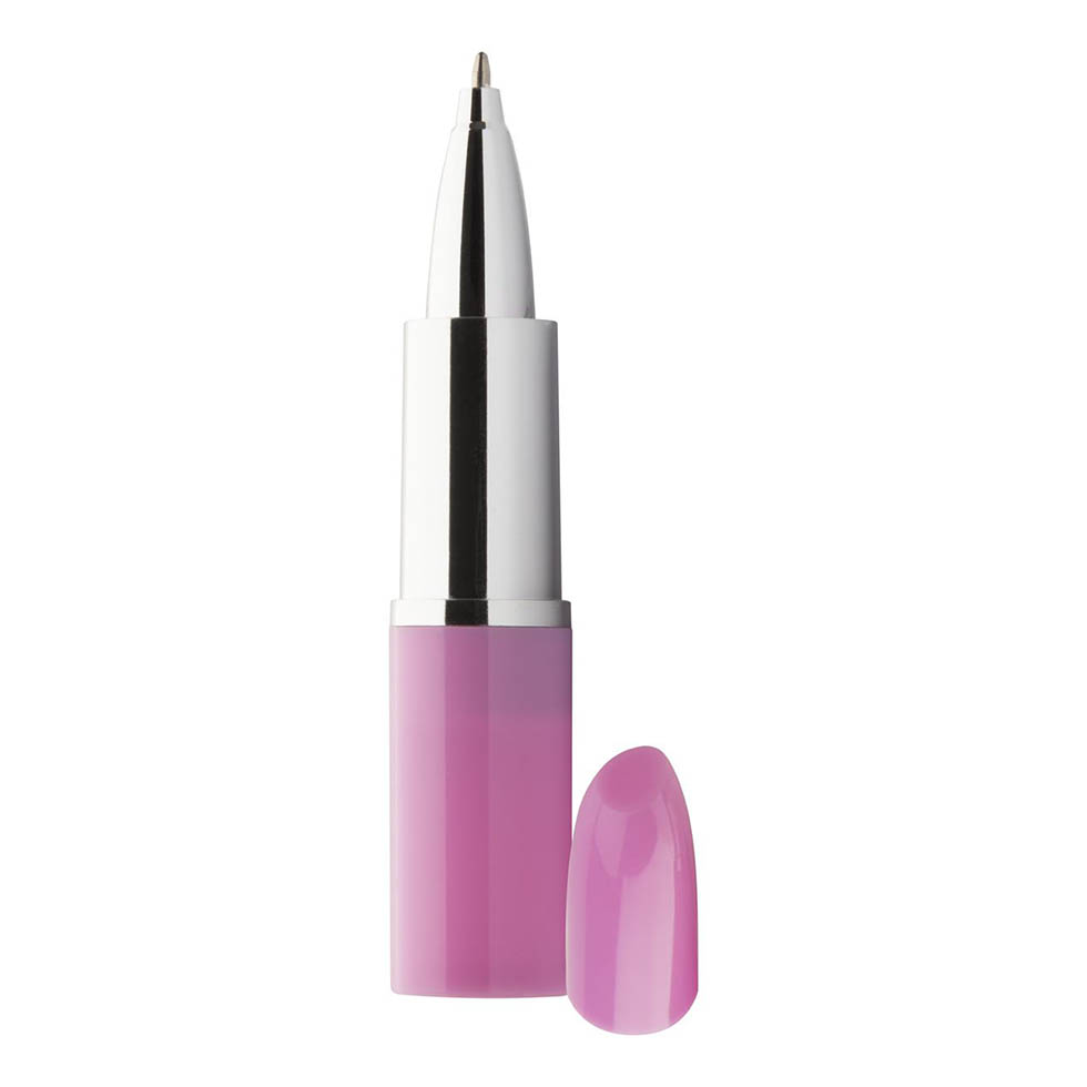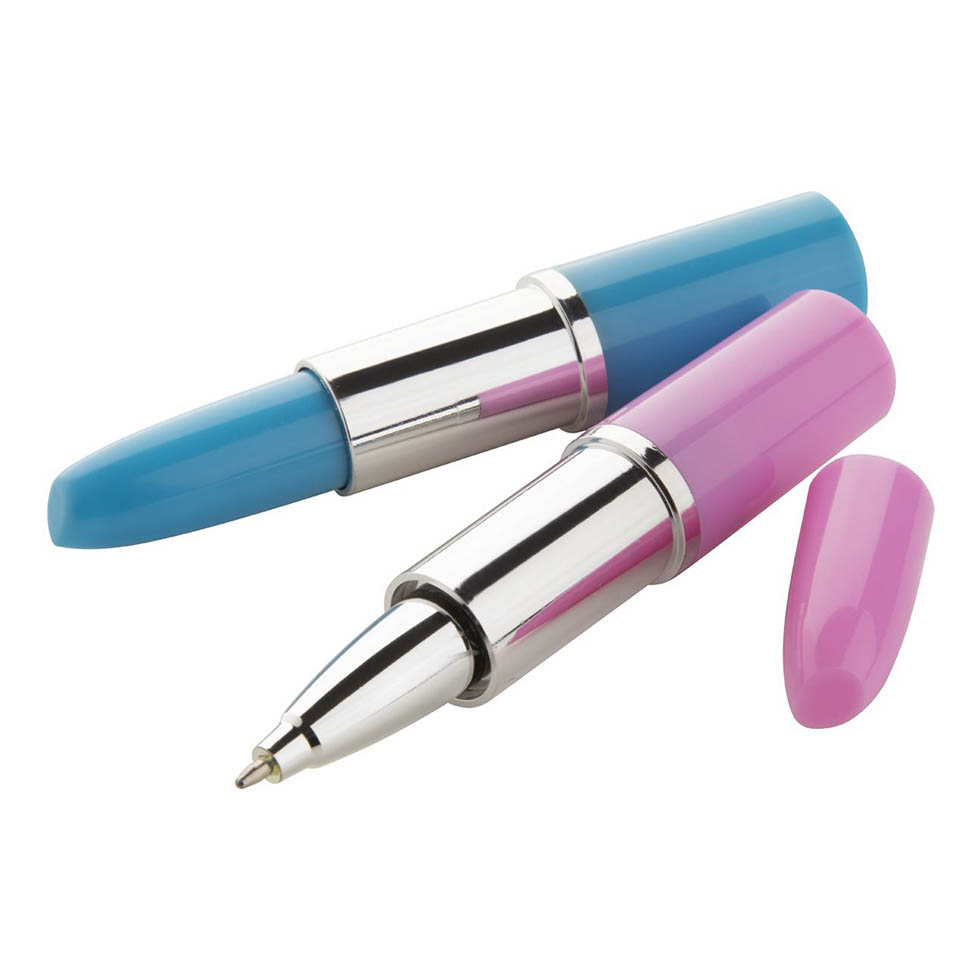 Lipstick shaped, plastic ballpoint pen. With blue refill.