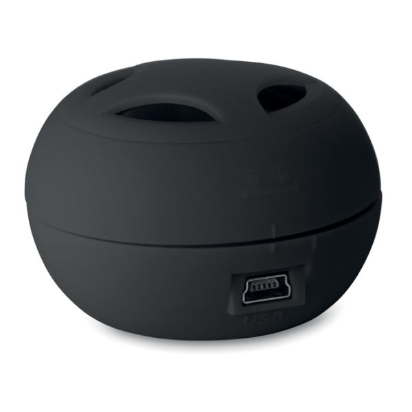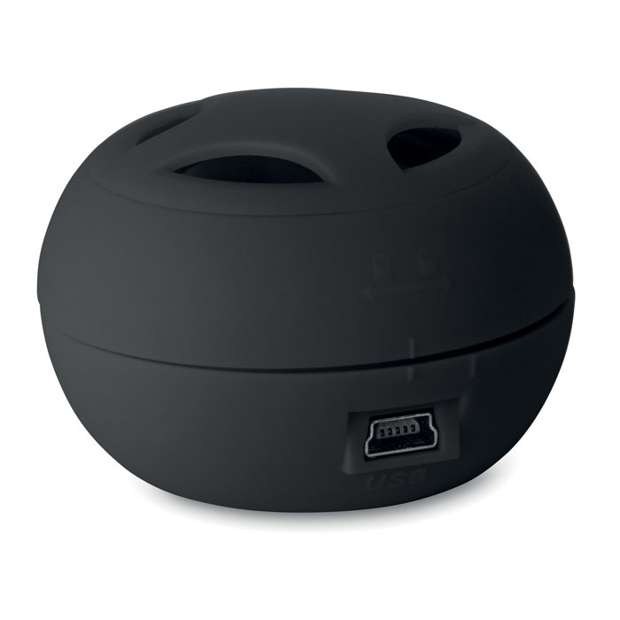 Mini speaker with cable. 1 Lithium 200mAh battery and mini USB cable included.