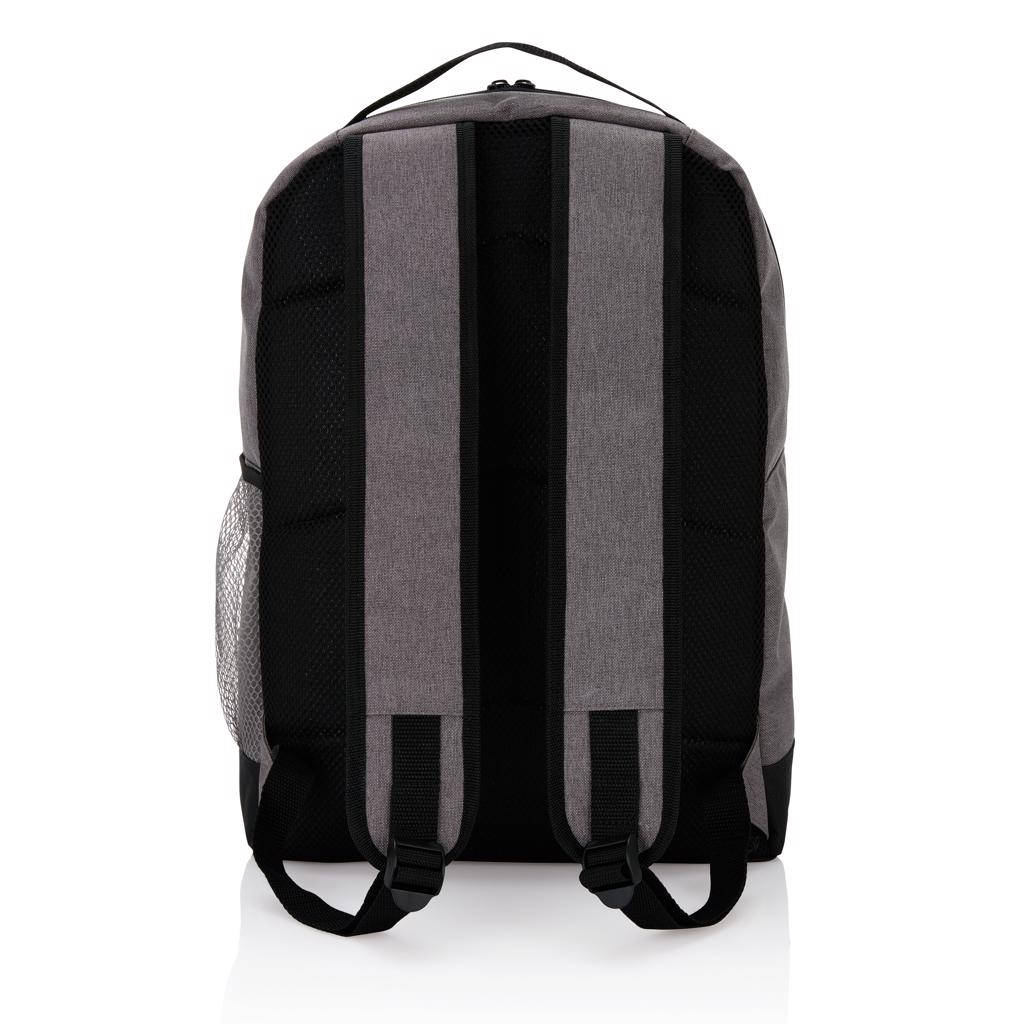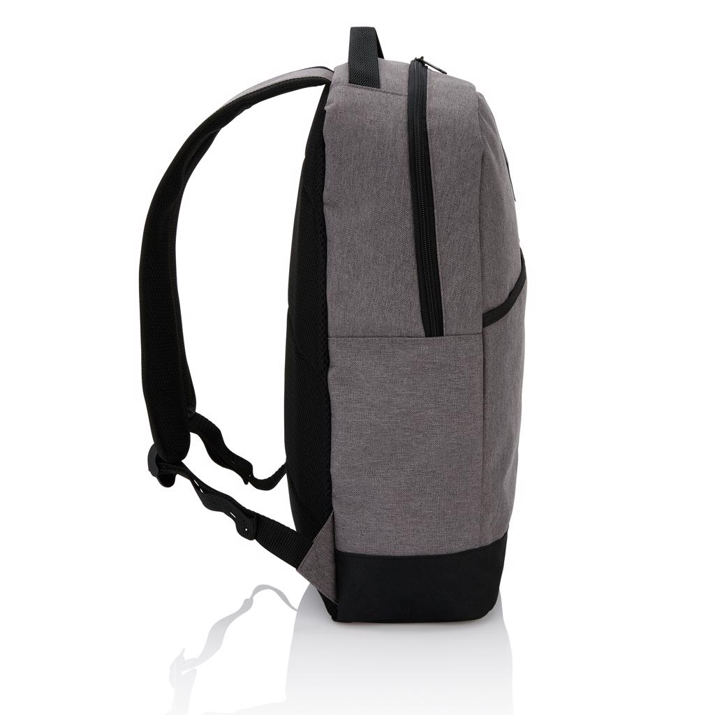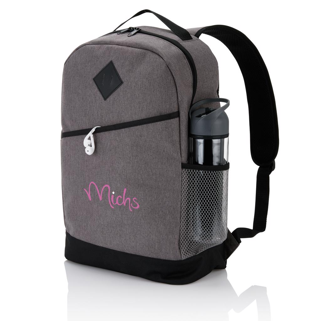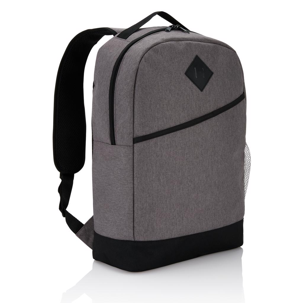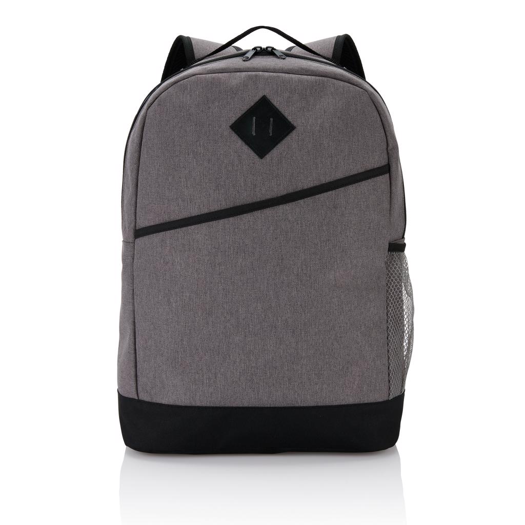 Modern 600D 2 tone polyester backpack with a zippered main compartment, a velcro front compartment, a side mesh pocket and adjustable padded shoulder straps. Air mesh padded back panel. PVC free.