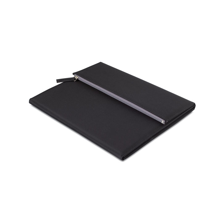A4 size portfolio in microfiber with 50 pages white paper block. The lateral flap, closed by a zipper, can store your ball pen or pencil.