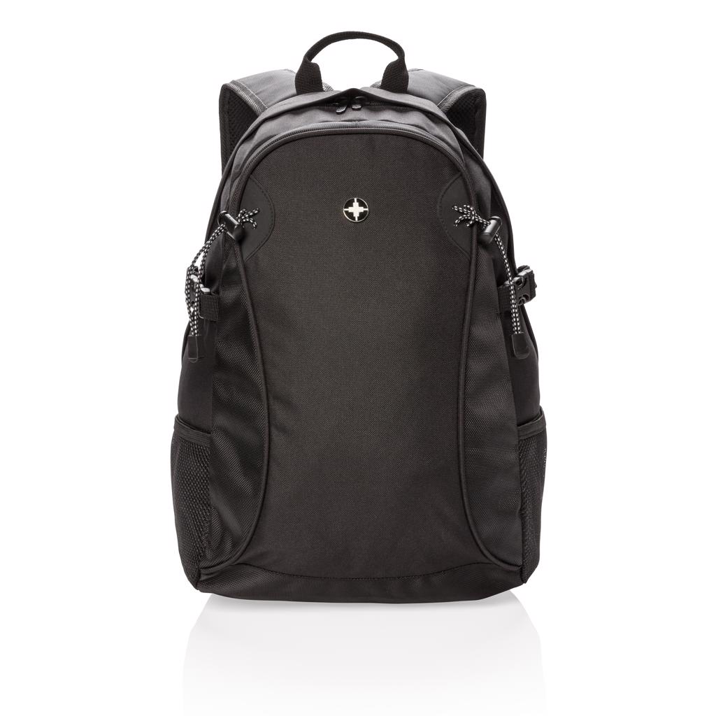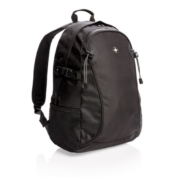 600D and 1680D polyester outdoor backpack with one large main compartment. Comfortable padded backpanel. Side mesh pockets can hold a water bottle or extra gear. PVC free.