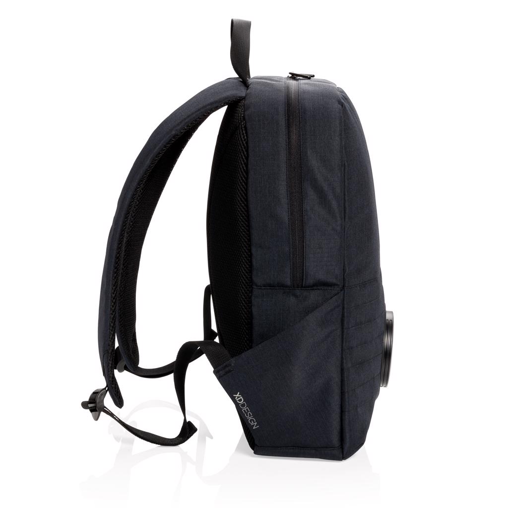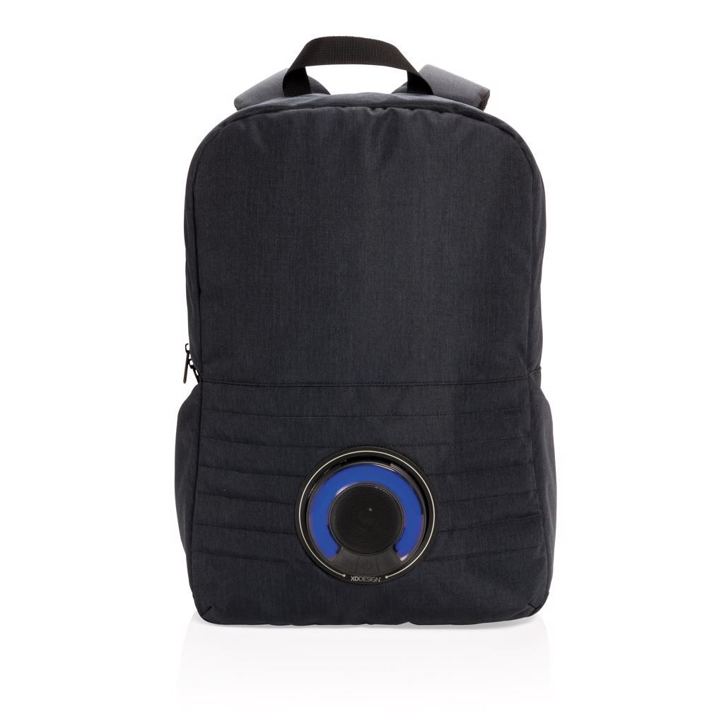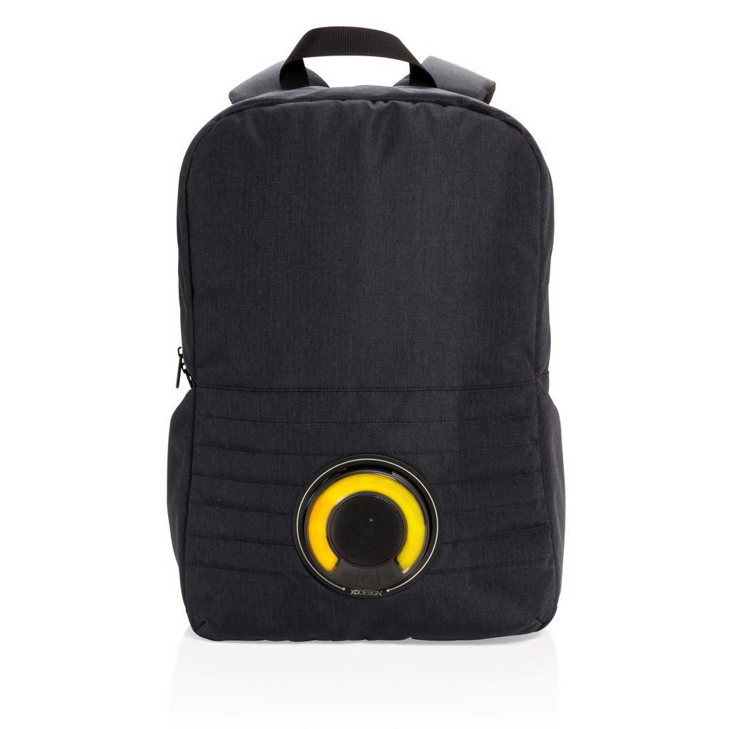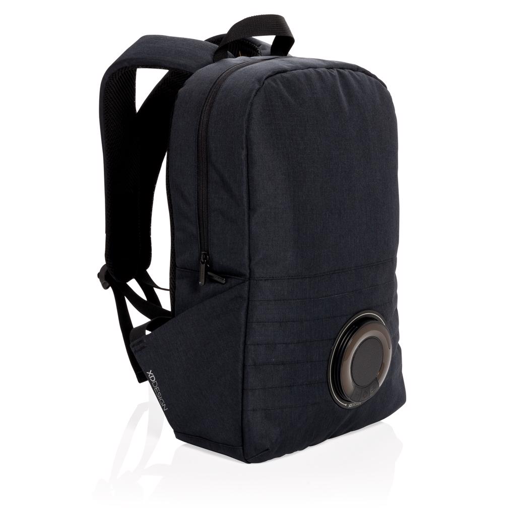 Trendy 15” laptop backpack with removable waterproof IPX5 wireless speaker with colour changing LED. Connect your powerbank easily to the integrated USB charging port and charge your phone or tablet on the go. Simply twist and take out the speaker to place it on your desk. 5 hour playtime. Registered design®