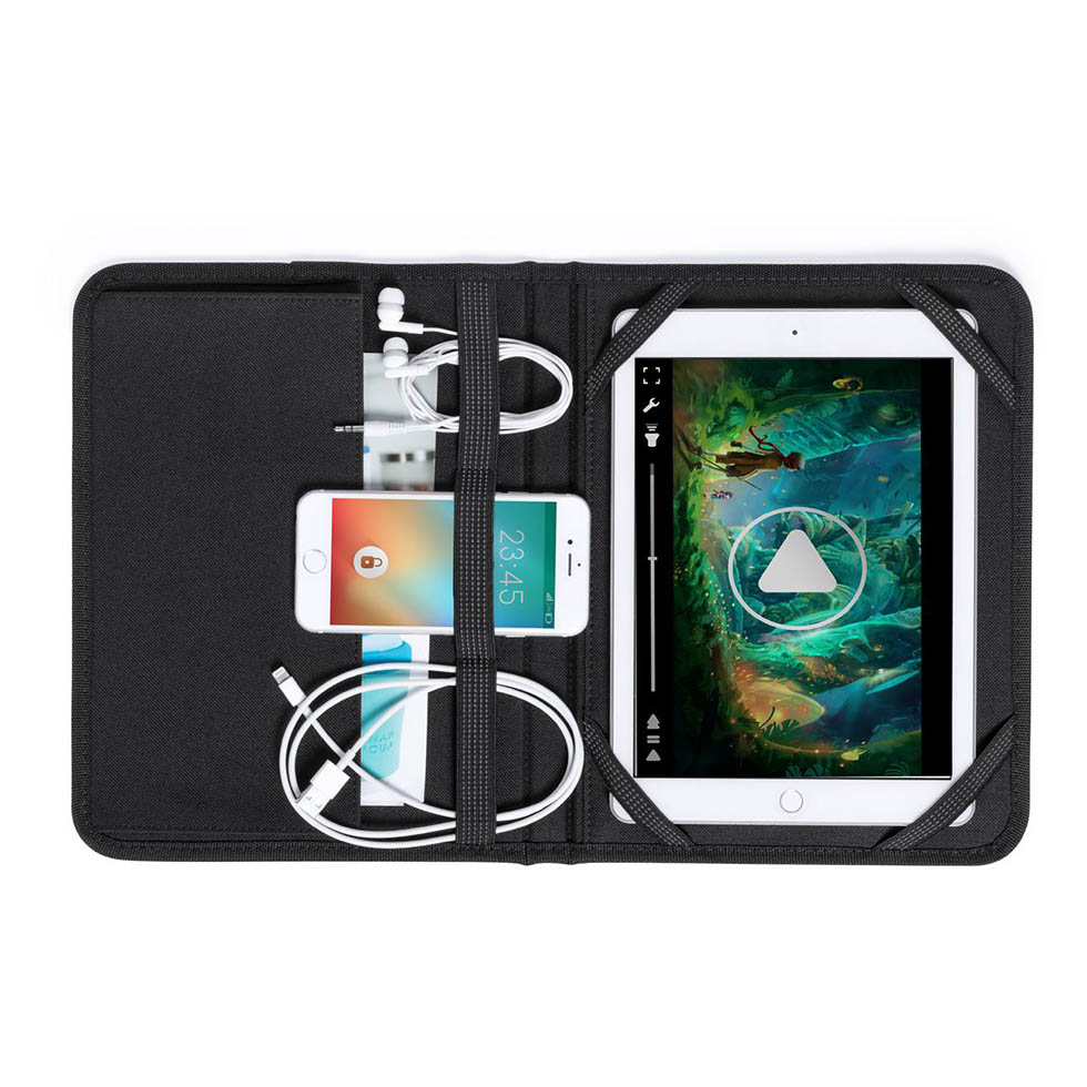 Resistant holder case for 9.7” tablets with adjustment strap, inside pocket and elastic band. 600D polyester.
