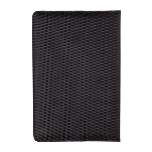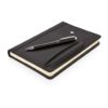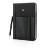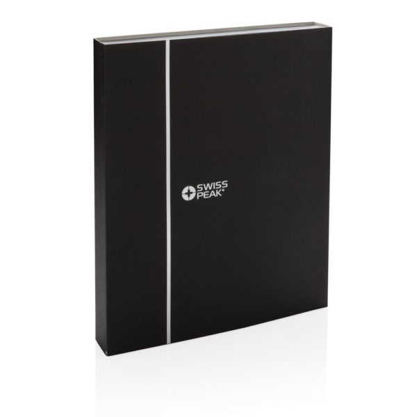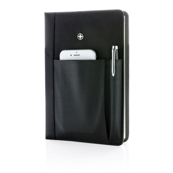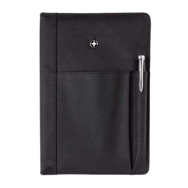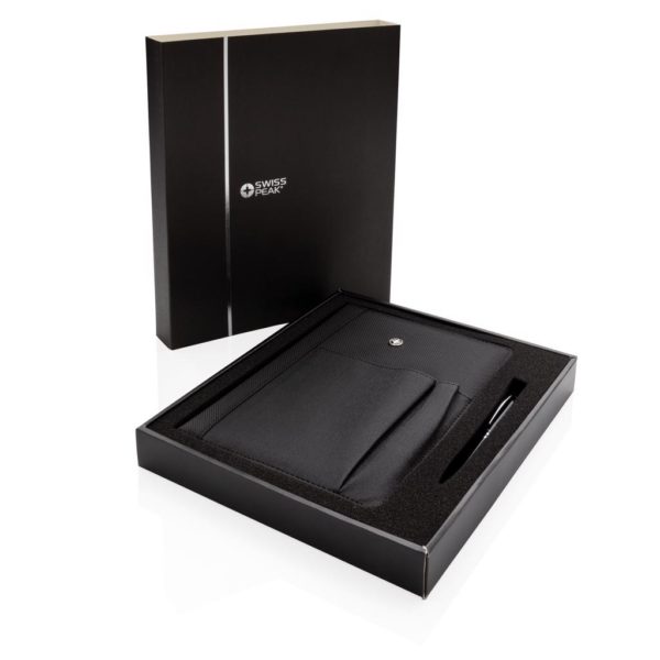 Executive 1680D and 600D polyester notebook cover with pen. Including removable notebook with 192 pages of 80g/m2 inside. Pocket on the cover can hold pen, cards, cash, mobile phone etc. Packed in Swiss Peak giftbox.