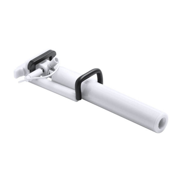 Stainless steel selfie stick with plastic grip and camera shutter button (3,5 mm Jack connection). With universal mobile holder.