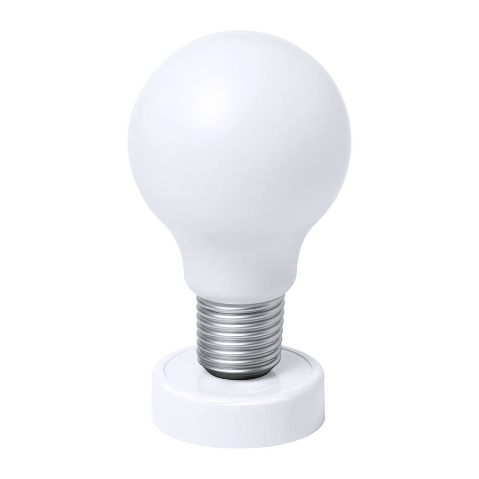 Light bulb shaped, plastic desk lamp with 1 LED. Operates with 4 AA batteries, without battery.