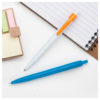 Plastic ballpoint pen with white barrel and coloured clip. With blue refill.