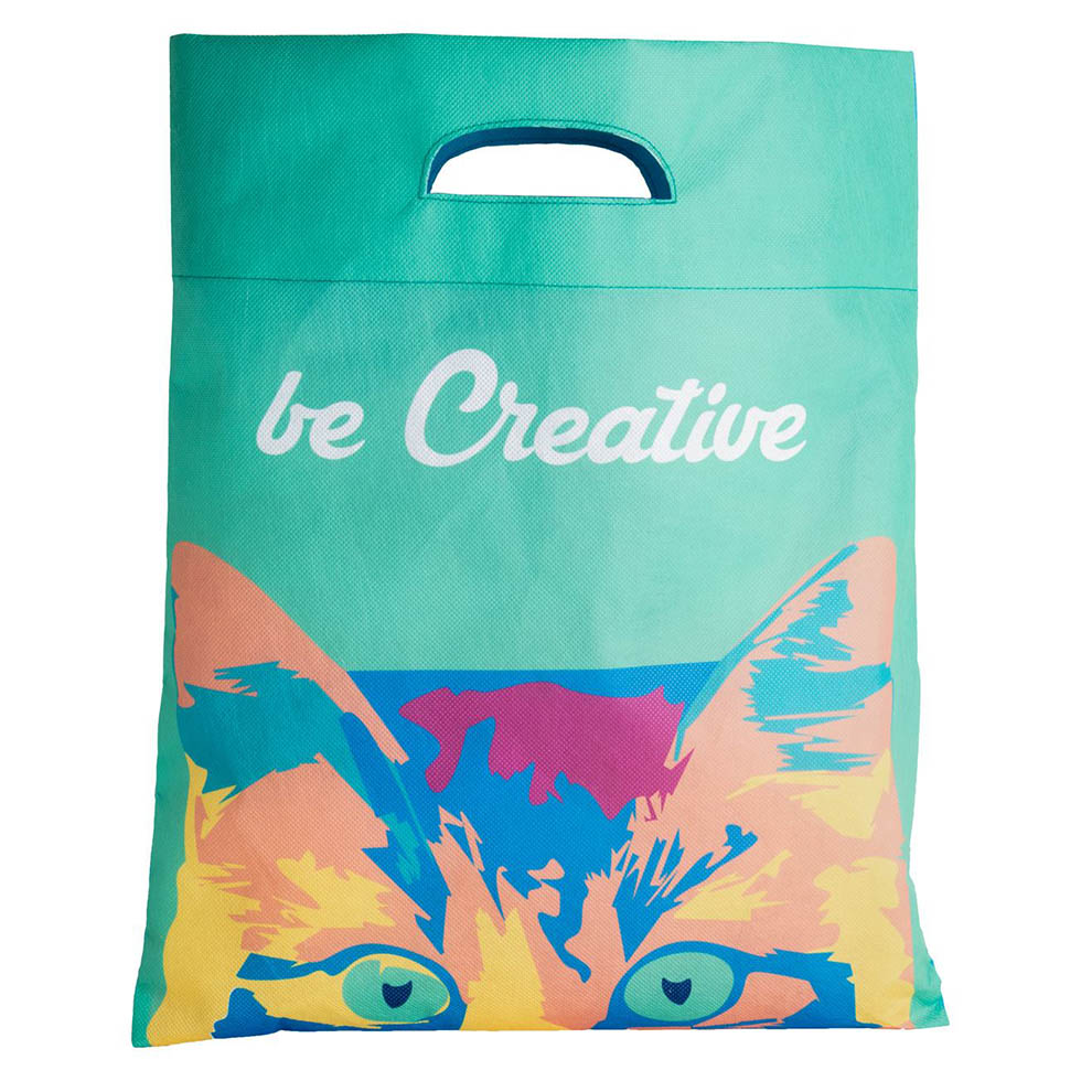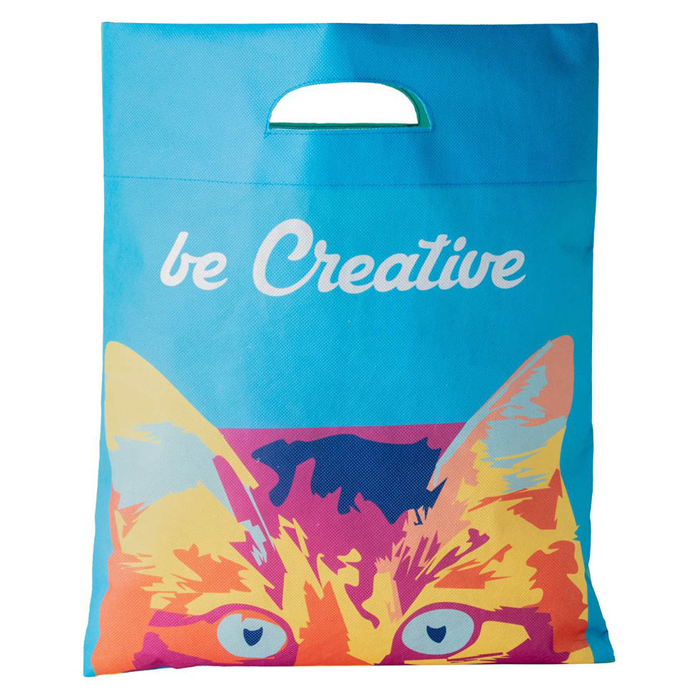 Custom made non-woven shopping bag with die-cut handles, 80 g/m². With sublimation printed graphics on both sides . MOQ: 100 pcs.