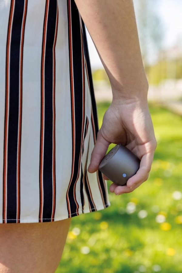 Compact 3W speaker with surprisingly clear and full range sound. The bottom section of the speaker has an extra driver to enhance bass performance. Made out of high quality stainless steel for a great look and feel. With 500 mAh battery that allows up to 5 hours playing of your favourite music. Operating distance up to 10 metres.