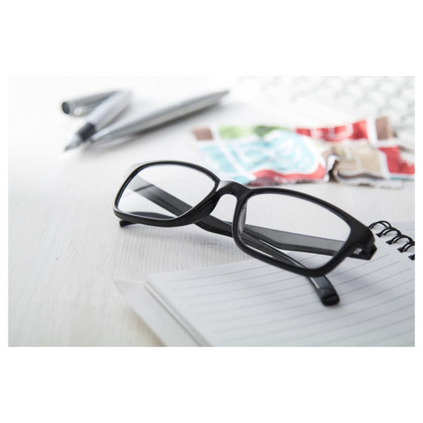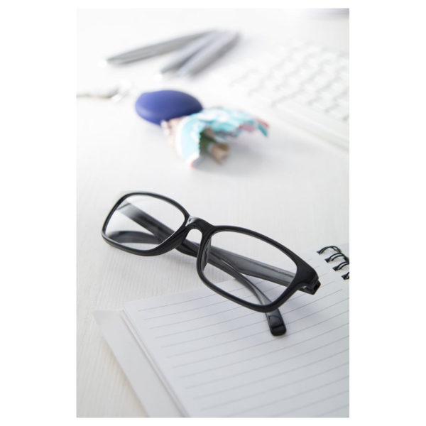 Plastic reading glasses with +1,5 dioptre lenses. In soft shell carry pouch.