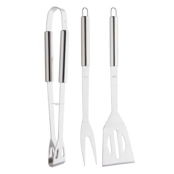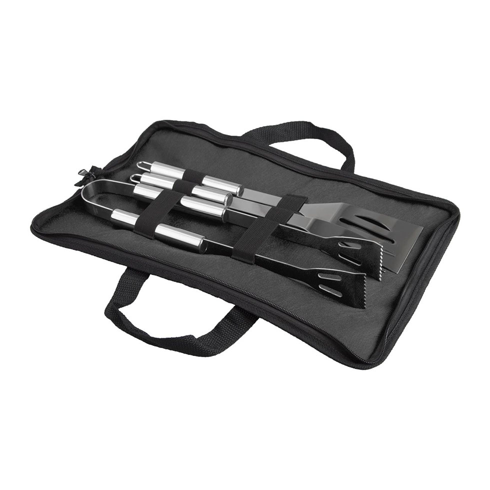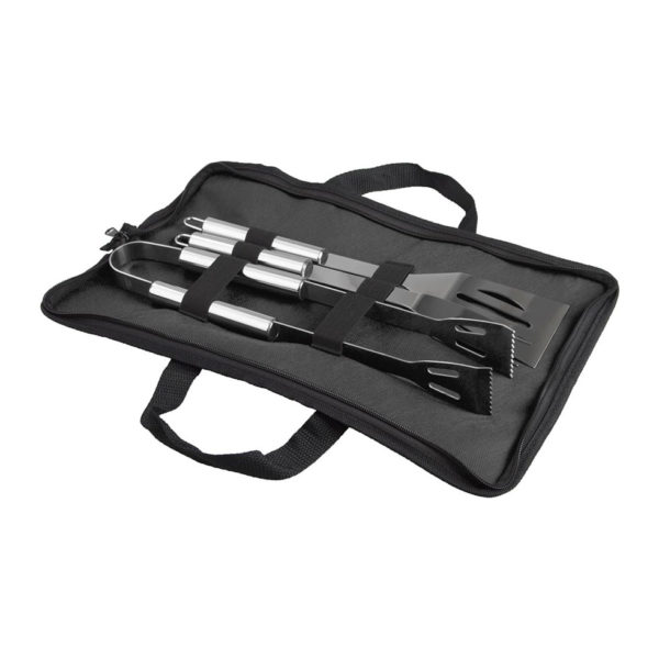 3 pcs stainless steel BBQ set (fork, shovel and clip) with zipped, nylon carry bag.