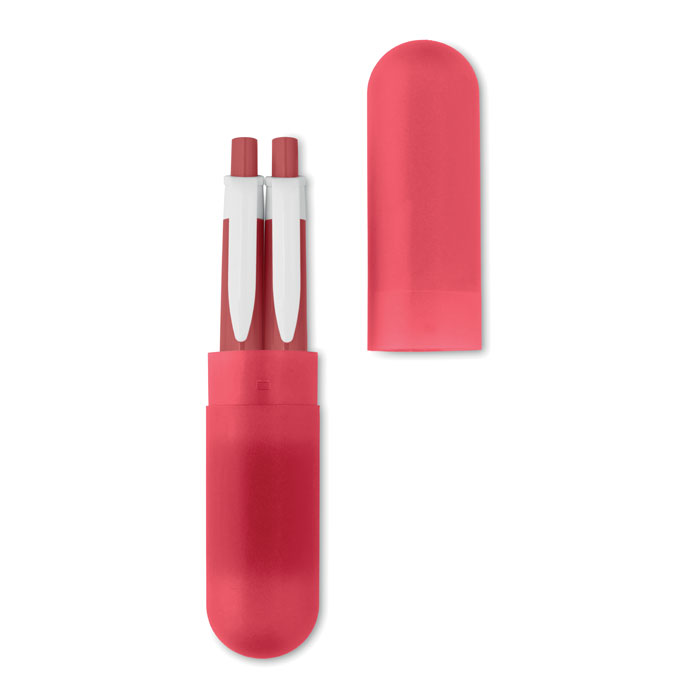 Push button pen and mechanical pencil set in translucent matching colour tube shaped box. Black ink.