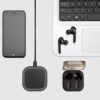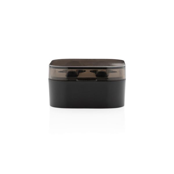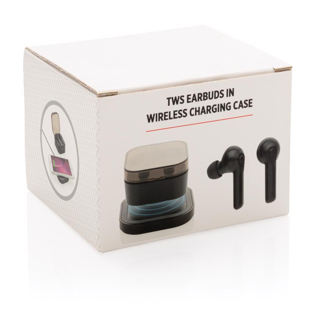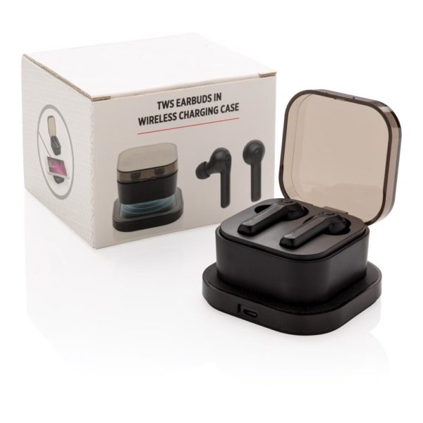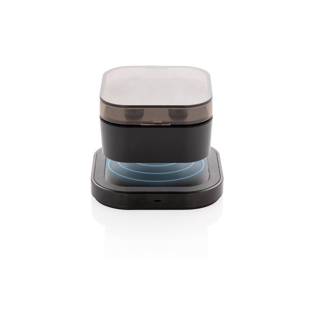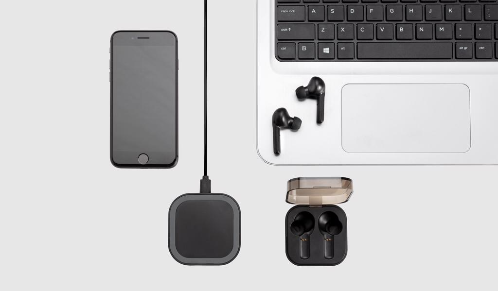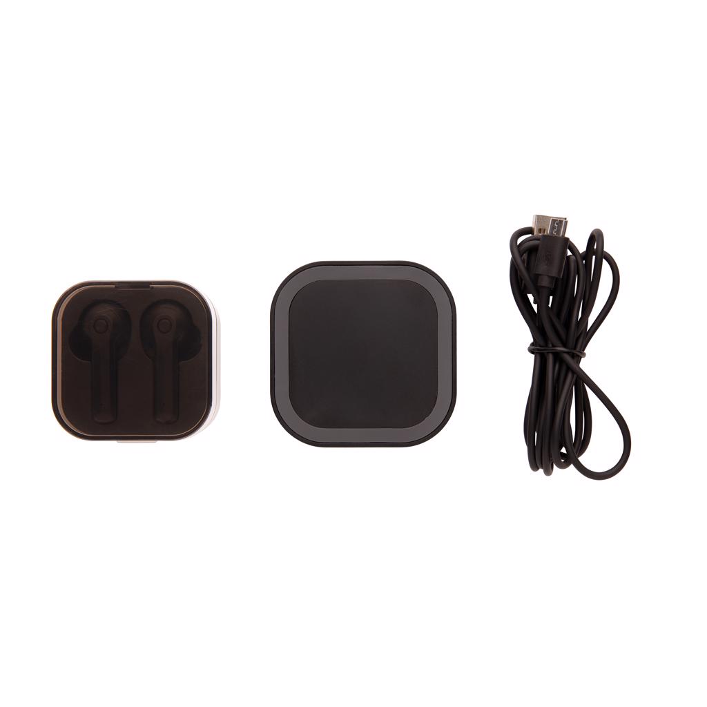 Ultimate freedom while listening to your favorite music with these true wireless earbuds. Simply pair both ABS earbuds to listen to your music in stereo and answer calls (mono). The earbuds come in a stylish charging case which can be charged wirelessly by the included 5W wireless charger. This charger can also be used to charge your mobile phone. The wireless charger is compatible with all QI enabled devices like Android latest generation, iPhone 8 and up. Including 150 cm micro cable. The earbuds use BT 4.2 for smooth connection and have a 50 mah battery that allows a play time of up to 3 hours and can be re-charged in 2 hours in the charging case. The wireless distance is up to 10 metres. Includes different size ear tips. Input 5V/1A Wireless output: 5V/1A.