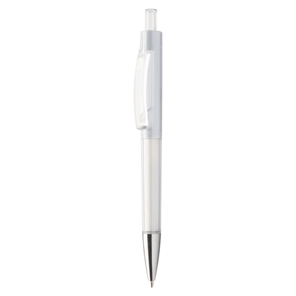 Transparent plastic ballpoint pen with chrome tip. With blue refill.